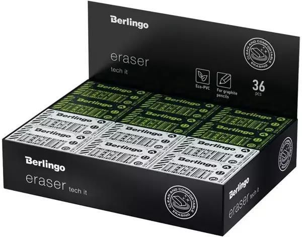 Gumki Berlingo "Tech it" wykonane są z EKO-PVC i są nietoksyczne. Doskonale radzą sobie z liniami z czarno-grafitowego ołówka, nie pozostawiają po sobie śladów i brudnych smug. Nie uszkadzają papieru. Każda gumka jest zapakowana w kartonową owijkę i folię, która chroni gumkę przed brudem i kurzem. . EAN: 4260738999274