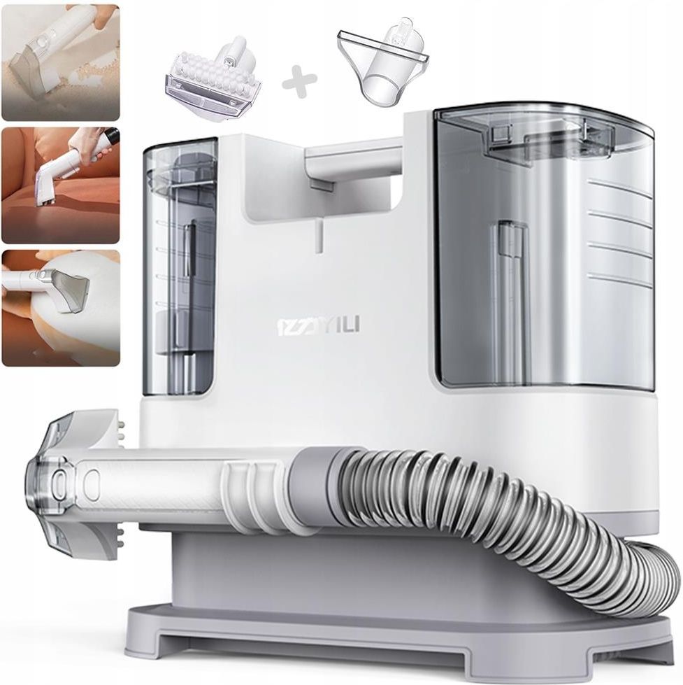 PRZENOŚNY ODKURZACZ DO PRANIA CZYSZCZENIA TAPICERKI DYWANÓW SOF + SZCZOTKA + SSAWKA Innowacyjny przenośny niewielkich rozmiarów odkurzacz wodny do prania i czyszczenia tapicerki. Działanie polega na dozowanie czystej wody z pierwszego zbiornika i wysysanie wody wraz z brudem do drugiego zbiornika Prostota i wygoda zastosowania. W każdym zestawie 2 ssawki: ssawko szczotka do czyszczenia trudniejszych plam która jednocześnie czyści i zasysa brud, druga ssawka krawędziowa tylko zasysa wodę z brudem oraz dociera do trudniej dostępnych wnęk i krawędzi sof lub innych miejsc. Końcówki ssawek posiadają specjalny dozownik wody, a rączka z przyciskiem umożliwia dozowanie jej w dowolnej ilości według naszych potrzeb. Zaawansowany silnik oraz filtry wodne. Idealny do czyszczenia świeżych plam jak i odświeżania po czasie różnych sof, foteli i innego rodzaju tapicerki. Nie zajmuje wiele miejsca w porównaniu do tradycyjnych dużych odkurzaczy piorących. IDEALNY DO USUWANIA POWSTAŁYCH PLAM PRZY DZIECIACH Wyczyść i odśwież dywany lub sofy w swoim domu dzięki głębokiemu czyszczeniu tej myjki do dywanów. Rozpocznij odkurzanie, aby uzyskać świeższe dywany, ponieważ silnik o mocy 380 świetnie wysysa wszelki brud i odświeża wygląd i zapach twojej tapicerki. Zaprojektowano dwa zbiorniki na wodę z dwoma zbiornikami na wodę do oddzielania wody czystej od brudnej. Zbiornik na czystą wodę o pojemności 1 l i zbiornik na brudną wodę o pojemności 0,5 l. SILNA MOC SSANIA Duża siła ssania, ponad 9 kPa, pozwala na usuwanie plam z kanap, dywanów, podłóg i other miejsc, takich jak mocz zwierząt domowych, plamy z czerwonego wina itp. Jako urządzenie do czyszczenia plam, sprawdzi się na dywanach. Zasada działania Wysokowydajne strumienie wodne wnikają głęboko w włosie, a wytrzymałe włosie usuwa osadzony brud i zapewnia głębokie czyszczenie. SZCZOTKA I SSAWKA SZCZELINOWA W ZESTAWIE Wraz z odkurzaczem otrzymują Państwo 2 końcówki. Jedna to ssawko szczotka do głębszego mycia, a druga to sama ssawka do wysysania brudnej wody. Ma ona krawędziową końcówkę i świetnie sprawdzi się do wnęk. SPOSÓB UŻYCIA Spryskaj powierzchnię płynem lub pianką do czyszczenia tapicerki zgodnie z zaleceniami producenta. Później napełnij czystą wodą zbiornik i rozpocznij odkurzanie. Dozując wodę odkurzaj brud, zobaczysz jak brudna woda napełnia się w drugim zbiorniku. Jeśli odkurzacz przestaje zasysać oznacza iż zbiornik na brudną wodę napełnił się i należy go opróżnić. Można również odświeżać powierzchnię samą wodą bez detergentów np. do świeżych plam lub usuwając tylko kórz i lekki niewidoczny brud z tapicerki. * Sam odkurzacz nie używa detergentów, nie wlewamy ich do zbiornika z wodą!