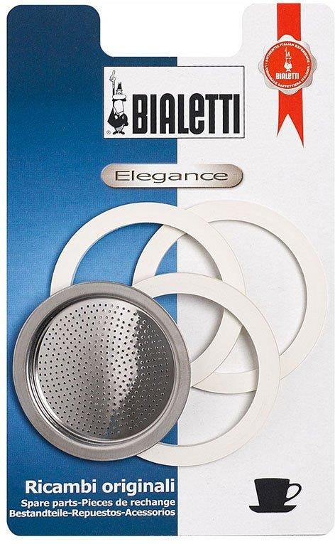 Zestaw uszczelek do kawiarki, wykonanych z gumy. Dodatkowo w komplecie znajduje się wymienne sitko ze stali nierdzewnej. Uszczelki pasują do modeli kawiarek Bialetti: Venus, Musa, Kitty. W celu zapewnienia prawidłowego działania kawiarki, zaleca się regularne czyszczenie uszczelki po każdorazowym użyciu oraz jej systematyczną wymianę. Najlepszej jakości części wymienne do kawiarek Bialetti.