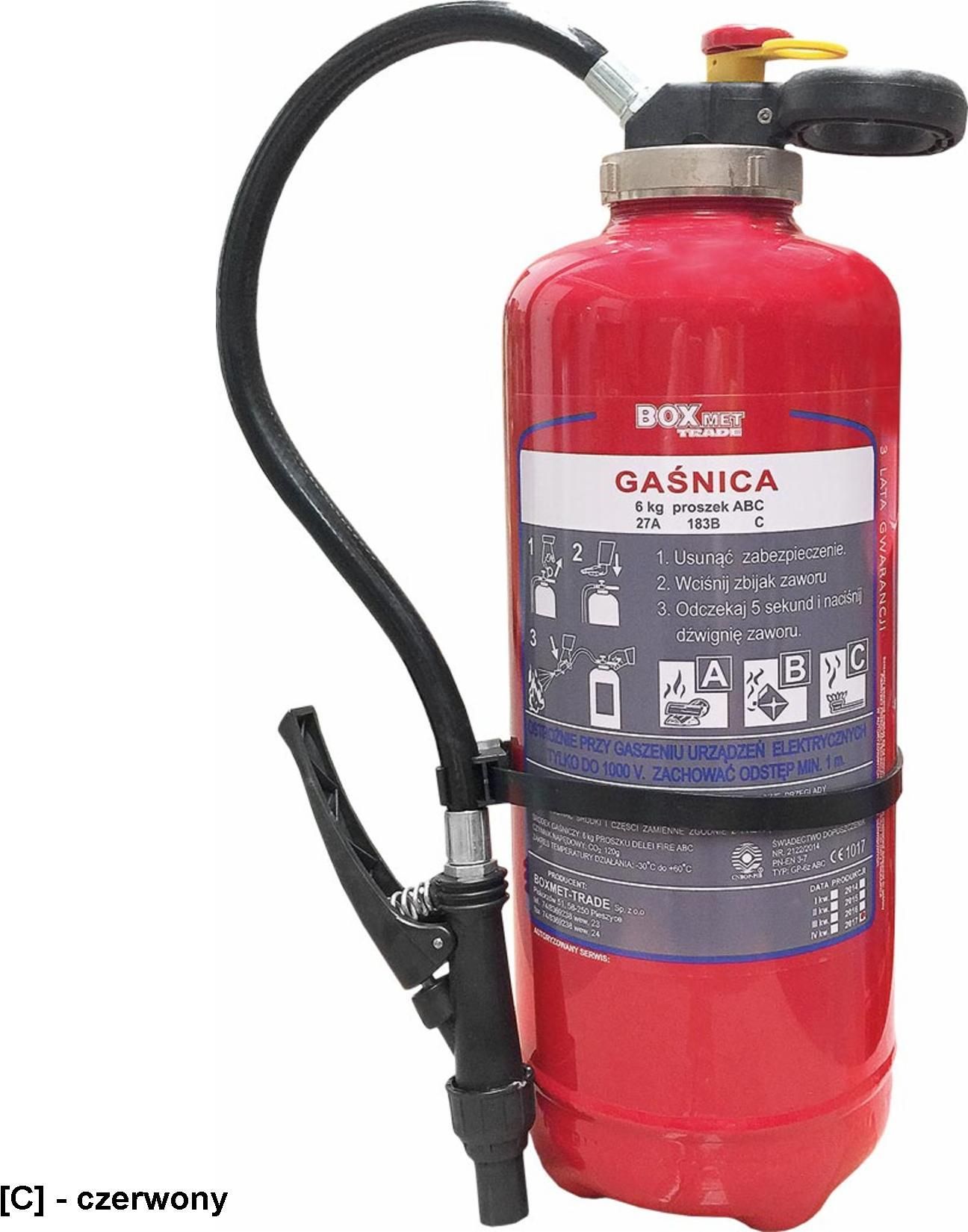 BX-GP-6XABC-N Gaśnica proszkowa 6 kg. gaśnica przeznaczona do gaszenia pożarów grupy ABC. Skuteczność gaśnicza 21 B. Czas działania 6 s. Zakres temperatur stosowania -20°C +60°C. Znajduje zastosowanie szczególnie w przemyśle oraz w laboratoriach chemicznych, składach aptecznych, halach przemysłowych, wytwórniach i magazynach cieczy i gazów palnych, stacjach paliwowych oraz lakierniach. Produkowana jest zgodnie z wymaganiami europejskiej normy PN-EN3 w oparciu o certyfikowany system jakości ISO 9001. Marka: BOXMET TRADE Produkt polecany dla branż: Obsługa techniczna obiektów w tym hoteli, prace domowe oraz porządkowe, kwiaciarnie,Przemysł chemiczny i petrochemiczny,Przemysł samochodowy w tym budowa, mechanika i naprawa pojazdów oraz lakiernictwo,Usługi ochrony w tym ratownicy i strażacy oraz obrona narodowa