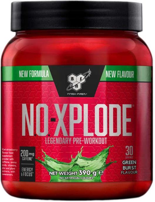 BSN NO-Xplode 390g Duża porcja kofeiny Zawiera witaminy i ekstrakty roślinne Pobudza i dodaje energii do treningu Wspiera skupienie i koncentracje Właściwości pompujące Sprzyja podniesieniu poziomu siły Wspomaga zmaksymalizowanie wydajności treningowej BSN NO-Xplode to suplement przedtreningowy, którego starannie opracowany skład wprowadzi twoje treningi na zupełnie nowy poziom. Duża zawartość kofeiny pobudza organizm i dodaje motywacji do działania, natomiast cytrulina i beta-alanina sprawią, że twoje mięśnie łatwiej się "napompują". Dodatkowo suplement firmy BSN wzbogacony został o zestaw witamin i minerałów, takich jak: cynk, niacyna, witamina C. Zawarty w składzie Różaniec górski wspomaga funkcjonowanie układu nerwowego i jego ochronę przed stresem oksydacyjnym, wspiera prawidłową strukturę i funkcjonowanie neuroprzekaźników oraz sprzyja poprawie koncentracji i procesów poznawczych Suplement diety w proszku Składniki Smak Red Rush: L-Cytrulina, beta-alanina, kwas winowy L (+), kwas cytrynowy), substancje przeciwzbrylające (krzemionka, krzemian wapnia), aromaty, kofeina, kwas L-askorbinowy, różeniec górski ( Rhodiola rosea L ) ( ekstrakt z korzenia), inulina, barwniki (burak, beta-karoten), substancje słodzące (sukraloza, acesulfam K), dwuwinian choliny, żeń-szeń fałszywy ( Panax notoginseng ) (ekstrakt z korzenia), ekstrakt z grejpfruta zawierający bioflawonoidy ( Citrus paradisi , owoc), nikotynamid, tlenek cynku, ekstrakt z pieprzu czarnego ( Piper nigrum , owoc). Smak Green Burst: L-Cytrulina, beta-alanina, kwas winowy L (+), kwas cytrynowy), substancje przeciwzbrylające (krzemionka, krzemian wapnia), aromaty, kofeina, kwas L-askorbinowy, różeniec górski ( Rhodiola rosea L .) (ekstrakt z korzenia), inulina, substancje słodzące (sukraloza, acesulfam K), dwuwinian choliny, żeń-szeń fałszywy ( Panax notoginseng ) (ekstrakt z korzenia), ekstrakt z grejpfruta zawierający bioflawonoidy ( Citrus paradisi , owoc), nikotynamid, barwnik (kurkumina), tlenek cynku, ekstrakt z pieprzu czarnego ( Piper nigrum , owoc), spirulina (proszek). Smak Purple Power: L-Cytrulina, beta-alanina, kwas winowy L (+), kwas cytrynowy), substancje przeciwzbrylające (krzemionka, krzemian wapnia), aromaty, kofeina, kwas L-askorbinowy, różeniec górski ( Rhodiola rosea L. ) (ekstrakt z korzenia), inulina, barwnik (burak), substancje słodzące (sukraloza, acesulfam K), dwuwinian choliny, żeń-szeń fałszywy ( Panax notoginseng ) (ekstrakt z korzenia), ekstrakt z grejpfruta zawierający bioflawonoidy ( Citrus paradisi , owoc), nikotynamid, spirulina (proszek), tlenek cynku, ekstrakt z pieprzu czarnego ( Piper nigrum , owoc). Zalecane spożycie Wymieszaj 13 g proszku z 200 ml zimnej wody i spożyj 20-30 minut przed treningiem. Przyjmuj raz dziennie. Informacje żywieniowe Wartości odżywcze (wszystkie smaki) 1 porcja (13 g) Witamina C 80 mg Niacyna 32 mg Cynk 10 mg Cytrulina 6 g Beta-alanina 3,2 g Kofeina 200 mg Różeniec górski ( Rhodiola rosea L .) 200 mg Dwuwinian choliny 50 mg Żeń-szeń fałszywy ( Panax notoginseng ) 50 mg Bioflawonoidy z grejpfruta 50 mg Piperyna 5 mg Uwaga Zawiera kofeinę (200 mg/porcję). Nie jest przeznaczony dla dzieci i kobiet w ciąży. Przechowywać w chłodnym i suchym miejscu. Chronić przed bezpośrednim działaniem promieni słonecznych. Alergeny: Może zawierać mleko, gluten, jaja, soję, orzechy i orzeszki ziemne.
