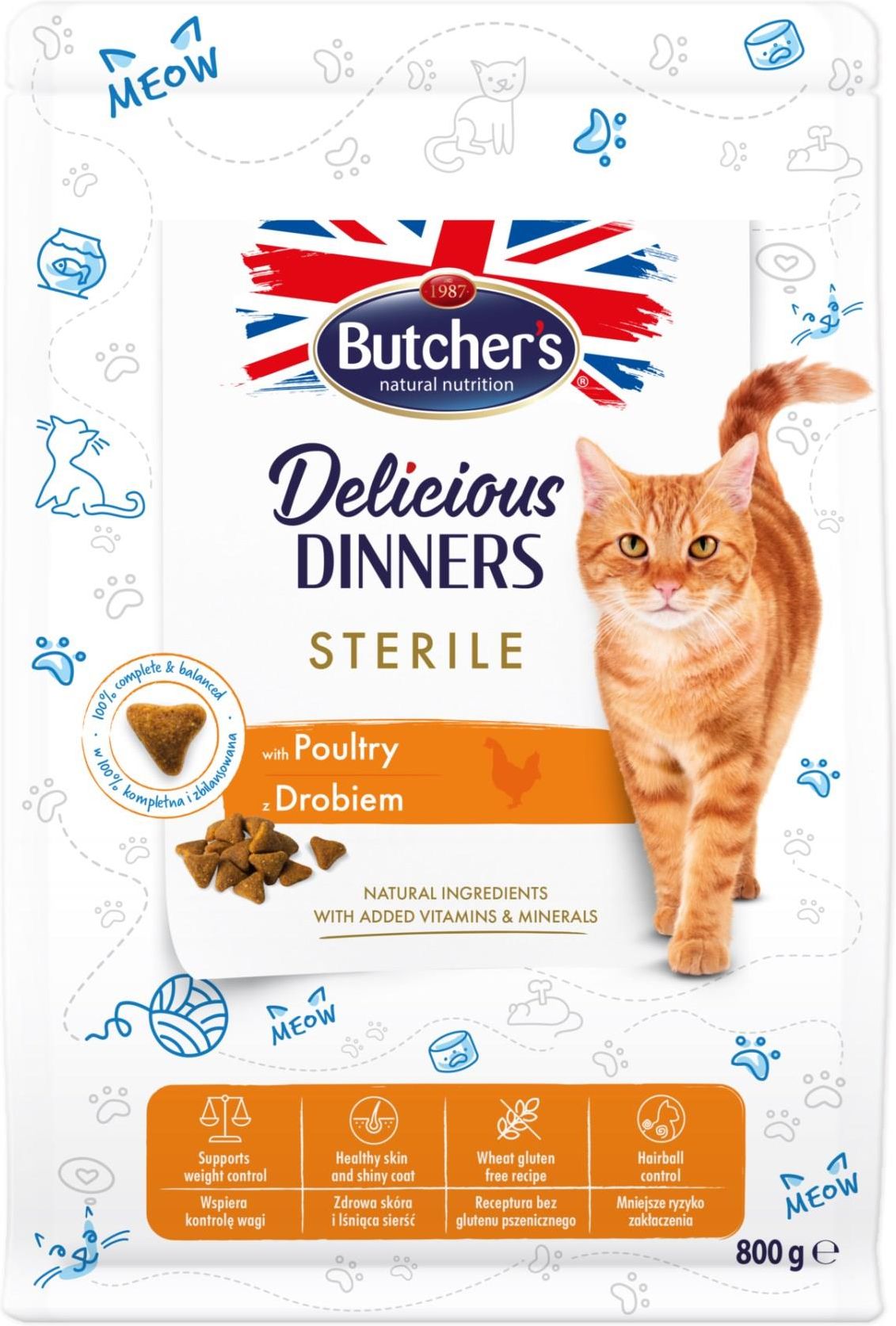 Butcher's Delicious Dinners Sterile, sucha karma dla kota, z drobiem 800g Dla kota wszystko. Wszystko, co najlepsze! Butcher’s Delicious Dinners Sterile to sucha karma dla kotów niewychodzących, kotów po zabiegu sterylizacji lub kastracji oraz kocich seniorów, z naturalnie niższym poziomem aktywności. To pełnoporcjowa, kompletna i doskonale zbilansowana karma przeznaczona do codziennego żywienia Twojego pupila. Opracowana przez ekspertów żywieniowych bezglutenowa receptura z dodatkiem l-karnityny pomaga przekształcić tłuszcz w energię. Zapewnia wsparcie kontroli wagi dzięki zwiększonej zawartości włókna pokarmowego (100% więcej w porównaniu do karmy Butcher’s Delicate Digestion!) Zawiera celulozę, która pomaga zmniejszyć ryzyko formowania się kul włosowych w przewodzie pokarmowym. Zawiera ryż, który wspomaga prawidłową pracę układu trawiennego. Opakowanie z wygodnym, szczelnym zamknięciem na rzep umożliwia wielokrotne otwieranie i zamykanie. Dzięki temu karma na dłużej zachowa swoją świeżość i pyszny smak. Sucha karma Butcher’s Delicious Dinners to pełnowartościowe posiłki, które precyzyjnie odpowiadają na potrzeby żywieniowe kota, wspierając jego zdrowie i energię przez wiele lat.  Dodatek oleju z łososia wzmacnia odporność, a jednocześnie wspomaga zdrowie skóry i nadaje sierści piękny blask. Skład oparty na naturalnych składnikach wzbogaconych o kluczowe witaminy i minerały, zapewnia bezpieczną, dobrze zbilansowaną dietę. Formuła bez glutenu pszenicznego. Drogi Kliencie, jesteśmy w trakcie procesu zmiany opakowań. Jeśli otrzymałeś produkt w innym opakowaniu, nie martw się – jest to ten sam produkt, który kupiłeś. SKŁAD:  Suszony drób 17%, kukurydza, białko zwierzęce, ryż, groch, tłuszcz drobiowy, celuloza 5%, gluten kukurydziany, hydrolizowana wątróbka kurczaka, olej z łososia 0,5%, nasiona lnu, suszony łosoś, proszek jajeczny, drożdże piwowarskie, inulina, żurawina, ekstrakt z Juki Schidigera 0,015%.  ANALIZA SKŁADU [%]:  białko surowe 36, tłuszcz surowy 12, popiół surowy 4,3, włókno surowe 5, wapń 0,85, fosfor 0,73 DODATKI [/kg]: DL-metionina 2500 mg, tauryna 1000 mg, L-karnityna 300 mg, witamina A 18000 IU, witamina D3 1800 IU, witamina E 600 mg, żelazo 75 mg, cynk 65 mg, mangan 30 mg, miedź 5 mg, jod 1,5 mg, selen 0,1 mg DODATKI ZOOTECHNICZNE: Chlorek amonu 3000 mg DZIENNE DAWKOWANIE (g/dzień) Waga kota [kg] - Koty kastrowane/sterylizowane - Koty niekastrowane/ niesterylizowane 2 kg - 30 - 35 3 kg - 40 - 45 4 kg - 50 - 55 5 kg - 55 - 65 6 kg - 65 - 75 7 kg - 70 - 85 8 kg - 80 - 90 Dane mają jedynie charakter informacyjny. Konieczne musi być indywidualne dostosowanie ilości karmy, by uzyskać stałą i korzystną dla zdrowia wagę kota. Upewnij się, że zwierzę ma dostęp do świeżej i czystej wody do picia przez cały czas. Zaleca się, by podzielić dzienną porcję na przynajmniej dwa posiłki w ciągu dnia. Karmy z linii Delicious Dinners to pyszne, pełne najwyższej jakości składników dania, dzięki czemu zaspokoją nawet najbardziej wymagających kocich koneserów.  Poznaj inne produkty Butcher's Delicious Dinners