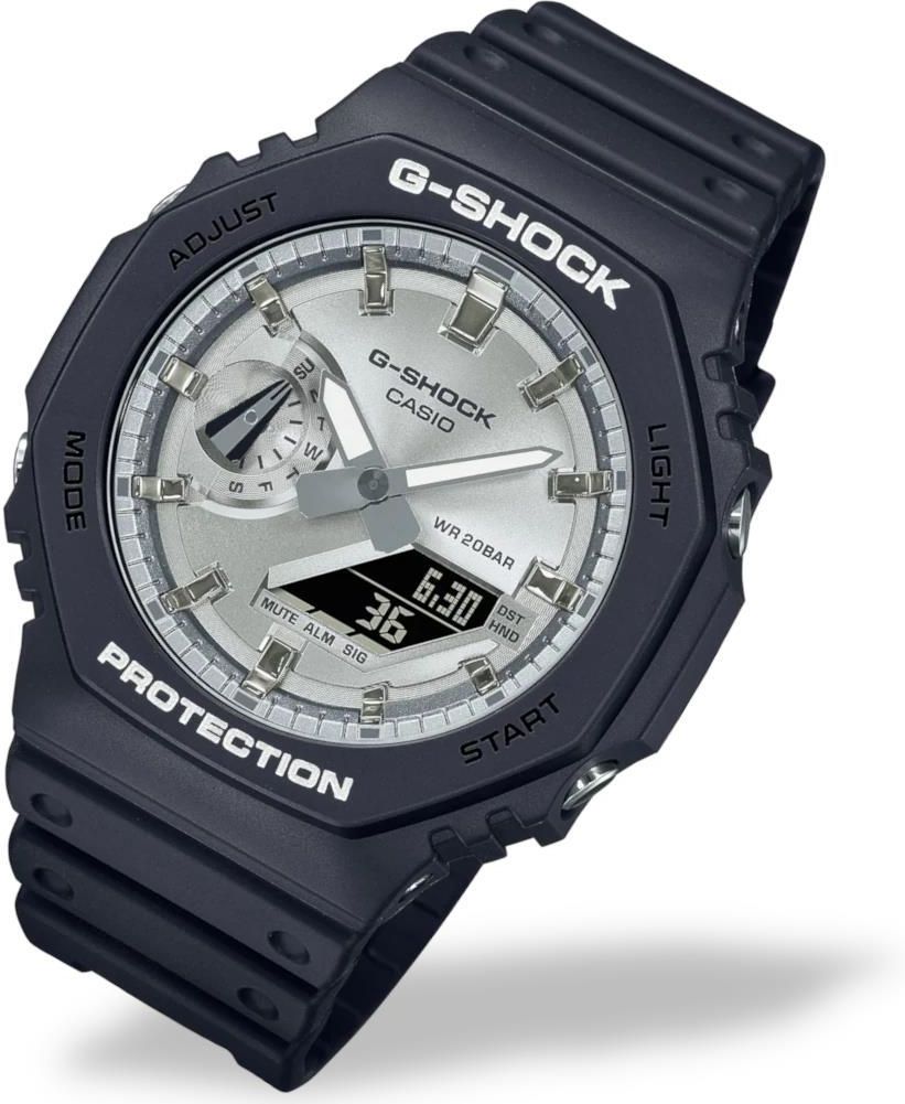 Casio GA-2100SB -1AER Zegarki od zawsze były nie tylko narzędziem do mierzenia czasu, ale również wyrazem stylu i osobowości ich właścicieli. W dzisiejszych czasach, kiedy technologia łączy się z designem, wybór odpowiedniego zegarka może znacząco wpłynąć na Twój wizerunek. W tym opisie przyjrzymy się bliżej zegarkowi Casio GA-2100SB -1AER, który doskonale łączy sportowy styl z zaawansowaną funkcjonalnością. Mechanizm i typ zegarka Casio GA-2100SB -1AER to zegarek o typie analogowo-cyfrowym, który łączy klasyczne wskazówki z cyfrowym wyświetlaczem. Dzięki temu oferuje zarówno tradycyjny wygląd, jak i nowoczesną funkcjonalność. Serce tego modelu stanowi mechanizm kwarcowy, znany ze swojej niezawodności i precyzji. Produkowany w Japonii mechanizm gwarantuje długą żywotność i minimalne odchylenia czasowe. Materiały koperty i szkło Koperta zegarka wykonana jest z wysokiej jakości tworzywa sztucznego, co zapewnia mu lekkość i wytrzymałość. Dodatkowo, włókno węglowe wzmacniające strukturę koperty podnosi odporność na uszkodzenia mechaniczne. Tarcza chroniona jest przez szkło mineralne, które cechuje się dużą odpornością na zarysowania oraz doskonałą przejrzystością, co zapewnia czytelność wskazań czasu. Pasek i wymiary zegarka Zegarek wyposażony jest w pasek wykonany z tworzywa sztucznego, który jest lekki i wygodny w noszeniu. Granatowy kolor paska harmonizuje z czarną kopertą i srebrną tarczą, tworząc dynamiczny, sportowy wygląd. Wymiary zegarka to: szerokość koperty: 45 mm, długość paska część z dziurkami: 120 mm, długość paska część ze sprzączką: 80 mm. Funkcje dodatkowe i wodoszczelność Casio GA-2100SB -1AER oferuje szereg funkcji dodatkowych, które czynią go niezwykle praktycznym narzędziem na co dzień. Zegarek posiada: alarm, budzik, datownik, funkcję G-Shock, kalendarz, podświetlenie LED, stoper precyzyjny do 1/100 sekundy, timer z możliwością ustawienia do sekundy. Dodatkowo zegarek jest wodoszczelny do 200m, co oznacza, że można go bez obaw nosić podczas pływania czy nurkowania. Zapięcie na sprzączkę gwarantuje pewność noszenia w każdych warunkach. Styl i design zegarka Casio GA-2100SB -1AER charakteryzuje się sportowym stylem, który idealnie komponuje się zarówno z codziennym strojem, jak i bardziej formalnymi okazjami. Okrągła koperta i granatowy pasek nadają mu dynamicznego wyglądu, a srebrna tarcza dodaje elegancji. Wzór logo na tarczy subtelnie podkreśla markę producenta. Podsumowanie opisu zegarka Casio GA-2100SB -1AER Casio GA-2100SB -1AER to doskonały wybór dla mężczyzn poszukujących zegarka łączącego nowoczesną technologię z wytrzymałością i estetyką sportowego designu. Dzięki zaawansowanemu mechanizmowi kwarcowemu oraz szerokiemu wachlarzowi funkcji dodatkowych, ten model sprosta wymaganiom nawet najbardziej wymagających użytkowników. Jeśli cenisz sobie zarówno aktywny tryb życia, jak i subtelne akcenty elegancji, ten zegarek jest stworzony właśnie dla Ciebie.