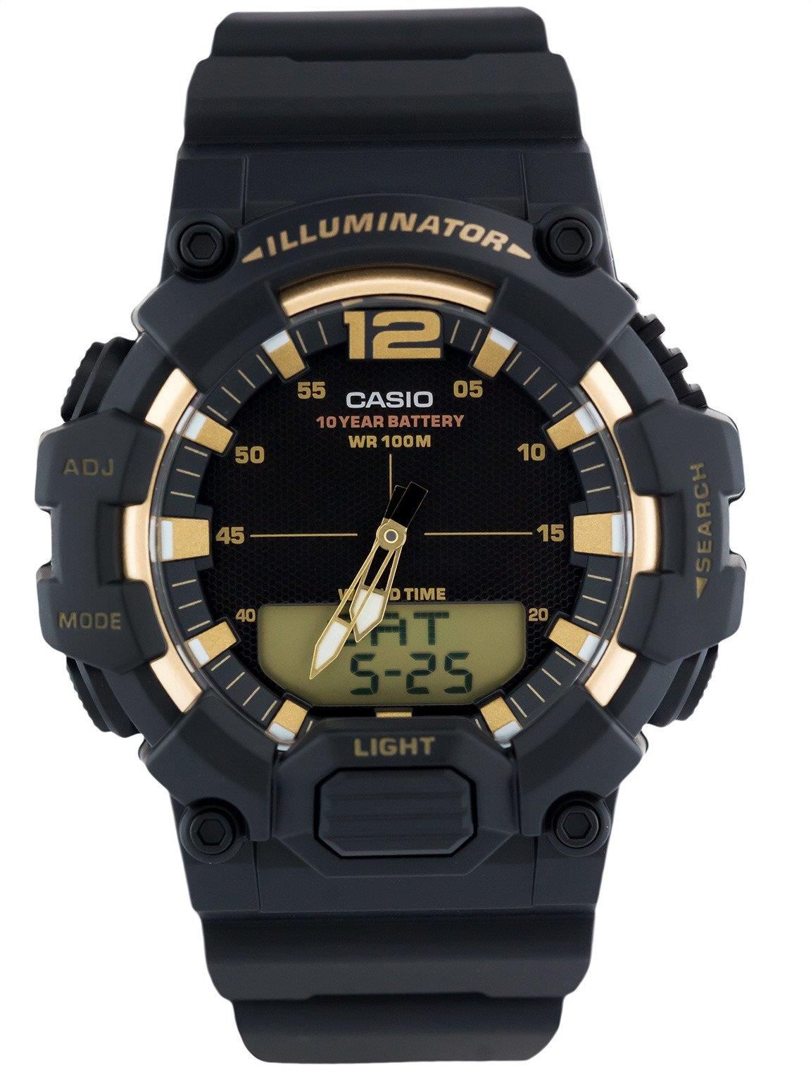 Casio Sport Hdc-700-9A O zegarkach marki Casio: Męskie zegarki Casio to obecnie jedne z najchętniej wybieranych dodatków dla nowoczesnego faceta. To nieodzowny element garderoby, który uzupełnia ją w stylowy sposób, a jednocześnie spełnia swoje podstawowe przeznaczenie wyznaczając porę dnia. Zegarki męskie Casio znakomicie wpisują się w obowiązujące trendy, a co więcej są coraz to bardziej zaawansowane technologicznie. Szeroki wybór wśród różnorodnych kolekcji pozwoli na wręcz idealne dopasowanie stylistyki, funkcjonalności i gabarytów do preferencji każdego konsumenta. Wszystko za sprawą tego, że firma Casio od wielu lat stara się odpowiadać na wszystkie potrzeby swoich klientów i tym samym kładzie nacisk na różnorodność. Casio Sport Hdc-700-9A to sportowy zegarek dla aktywnych mężczyzn. Koperta oraz elastyczny pasek, zostały wykonane z wysokiej jakości tworzyw. Ciemny cyferblat tego modelu został wykończony wskazówkami i wyświetlaczem cyfrowym. Na tarczy umiejscowiono czytelne indeksy. Model ten został wyposażony w szereg funkcji: pamieć 30 numerów telefonicznych, czas światowy, stoper i timer, 3 alarmy dzienne z funkcją drzemki oraz kalendarz automatyczny. Ogromną zaletą modeli HDC-700 jest bateria typu long life (przy standardowym użytkowaniu zegarka zapewnia pracę do 10 lat) oraz podwyższony stopień wodoszczelności do klasy 100M, która pozwala na swobodne pływanie i zanurzanie się w wodzie. Casio Sport Hdc-700-9A Specyfikacja: Mechanizm: Kwarcowy zasilany za pomocą baterii. Koperta: Wykonana z tworzywa sztucznego. Pasek: Wykonany z tworzywa sztucznego. Szkiełko: Akrylowe, bardzo przejrzyste. Wodoszczelność: 10 BAR - w zegarku można pływać. Podświetlenie: Dioda LED pozwala na odczytanie godziny w ciemności. Timer: Funkcja odliczania czasu wstecz. Maksymalny czas pomiaru to 24 godziny. Czas światowy: Zegarek wyświetla czas w różnych strefach czasowych. Stoper: Maksymalny czas pomiaru 24 godziny. Alarm: Zegarek posiada funkcję ustawienia do 3 alarmów w ciągu doby, w tym jednego z funkcją drzemki. Datownik: Wskazuje aktualną datę oraz nazwę dnia. Telememo: Możliwość zapisania w pamięci zegarka 30 imion i numerów telefonu. Wyświetlacz: Zegarek posiada system wyświetlania godziny 12/24. Wymiary: Koperta: szerokość 48 mm, wysokość 53 mm, grubość 15 mm Tarcza: średnica 30 mm Maksymalny obwód nadgarstka 22 cm. Kolorystyka: Koperta: Czarny Tarcza: Czarny Pasek: Czarny
