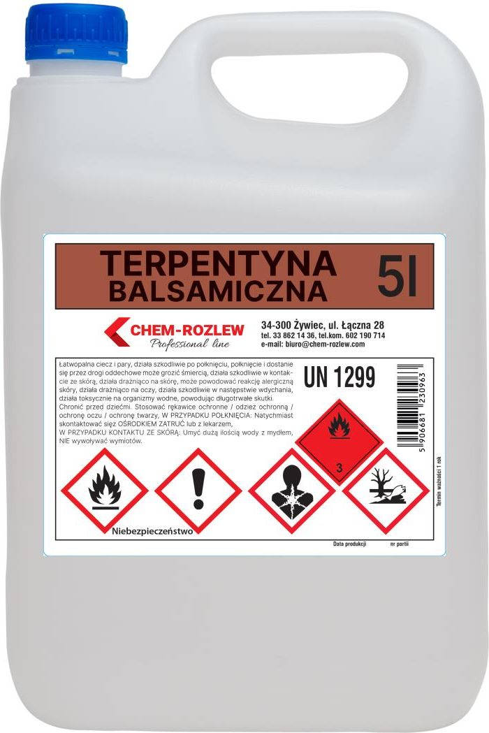 Chem-Rozlew Terpentyna balsamiczna rozpuszczalnik Pojemność: 5L Naturalna mieszanina terpenów o charakterystycznym intensywnym zapachu, łatwopalną i źle rozpuszczalną w wodzie. Zastosowanie Jako rozpuszczalnik farb i lakierów, do wyrobu past do obuwia i podłóg, jako surowiec do syntez organicznych. Używany przy pracach renowacyjnych, odnawianiu starych mebli, obrazów. Do usuwania plam olejnych po malowaniu, czyszczenia zatłuszczonych wykładzin z tworzyw sztucznych, mycia części metalowych ze smaru, oleju oraz pozostałości po wyrobach olejnych. Właściwości Barwa – bezbarwna lub żółta Gęstość – 0,850 – 0,870 kg/L Konsystencja – ciecz o charakterystycznym przyjemnym zapachu Okres ważności – 1 rok Sposób użycia Rozcieńczanie: postępować zgodnie z instrukcjami producenta wyrobu rozcieńczanego. Przeprowadzić próbę na małej ilości produktu. Czyszczenie narzędzi i zabrudzonych elementów: oczyszczany element zanurzyć w rozcieńczalniku lub przecierać namoczoną w rozcieńczalniku czystą szmatką lub czystym pędzlem. Następnie wytrzeć do sucha czystą szmatką. Czynność powielać, aż do uzyskania pożądanego efektu. Uwagi Można transportować w ujemnych temperaturach. Przechowywać w szczelnie zamkniętym,oryginalnym opakowaniu w temp. od 0ºC do +25ºC. Chronić przed dziećmi. Chronić przed bezpośrednim działaniem słońca. Po zakończeniu pracpomieszczenie należy wietrzyć.