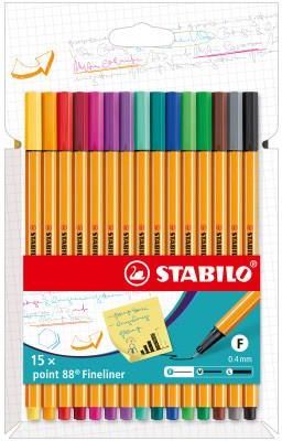 Cienkopis Stabilo Point zestaw 15 kolorów w etui plastikowym. Uniwersalny cienkopis do pisania, podkreślania, kreślenia i kolorowania. Mocna, oprawiona w metal końcówka jest odporna na złamania i rozwarstwienia, co gwarantuje wysoki komfort pisania aż do całkowitego wyczerpania tuszu. Grubość linii – 0,4 mm. Wentylowana skuwka umożliwia oddychanie w przypadku nagłego połknięcia. Niezaprzeczalny nr 1 wśród cienkopisów od 1977 r. W każdej sekundzie sprzedają się 4 cienkopisy point 88 w Europie. Plastikowe etui zawiera 15 szt. cienkopisów w kolorach podstawowych. Jedyny cienkopis dostępny aż w 47 kolorach oraz w kompletach. Plastikowe etui zawiera 15 szt. cienkopisów w kolorach: 15 kolorów podstawowych: 13, 36, 40, 41, 43, 44, 45, 46, 50, 51, 54, 55, 56, 58, 96 Dostępne również 15 szt cienkopisów w etui: 5 kolorów neonowych: 024, 033, 040, 054, 056 10 kolorów podstawowych: 36, 40, 41, 44, 46, 51, 54, 55, 56, 58