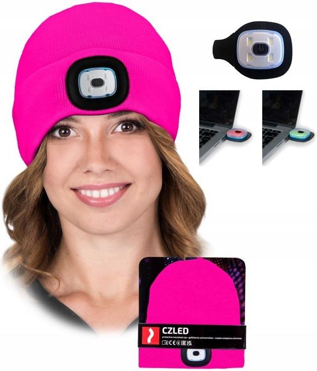 Ciepła Czapka Z Latarką Led Czołówka Różowa Ocieplana Polarem Ładowana Usb Kraków