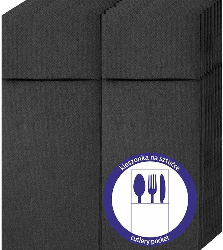 Clarina serwetki na sztućce „Kangurek” 50 sztuk Czarne Nr artykułu: 5738 Kolor: czarny Serwetki "kangurek" 32x38 cm 50 szt. Serwetki złożone w formie kieszonki, w której można umieścić sztućce.