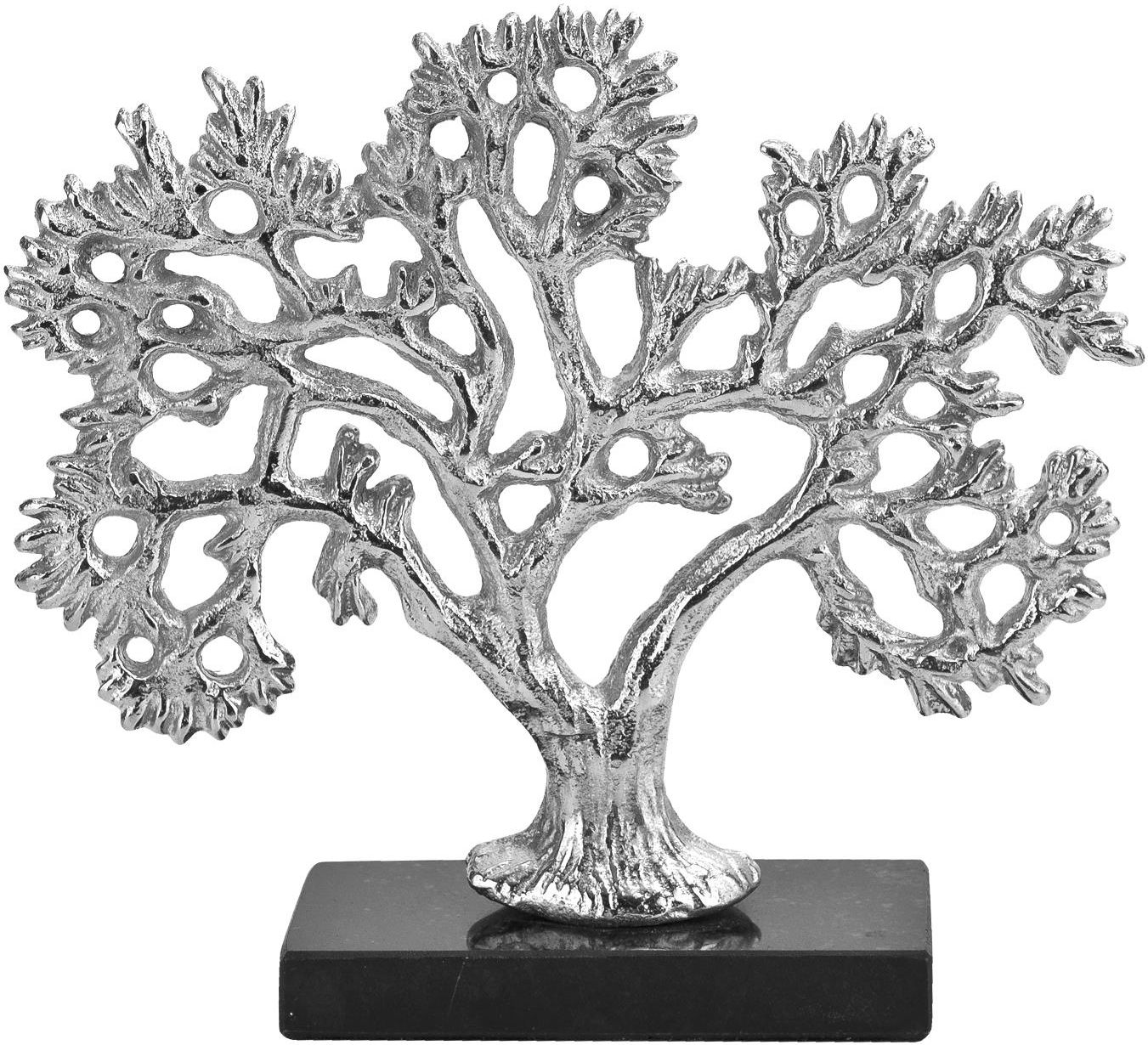Efektowna figurka ozdobna w postaci drzewa. Prezentuje się bardzo gustownie. Pięknie rozgałęzione drzewo w kolorze srebra - przytwierdzone do solidnej podstawy, która imituje granit - tworzy spójną całość. Dekoracje wnętrz są bardzo istotnym elementem wyposażenia. Od wieków towarzyszą ludzkości. Ozdabiają, upiększają i wnoszą do pomieszczeń charakterystyczny klimat. Niezależnie od stylu, jaki panuje w domu, ten produkt zawsze znajdzie swoje miejsce i zastosowanie. Drzewko dekoruje nie tylko stół, ale także półki ścienne, okna i inne meble (komody, witryny itp.) Ten nietuzinkowy przedmiot jest sprawdzonym pomysłem na prezent. Doskonale sprawdza się jako upominek dla nowożeńców czy na parapetówkę do nowo urządzonego domu, czy mieszkania.