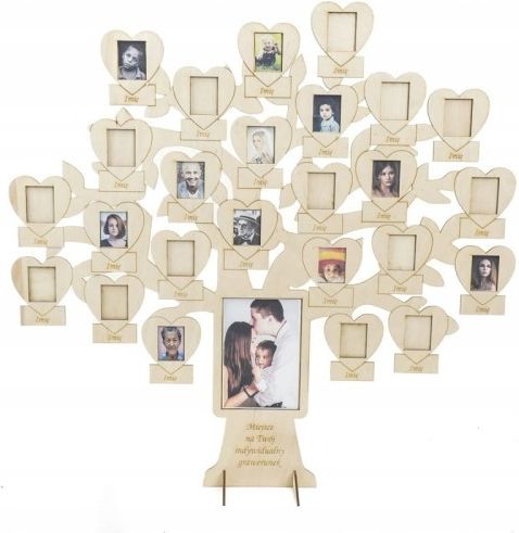 Deku – Drzewo genealogiczne ze zdjęciami 55x55 cm 709272 Chcesz stworzyć swoje własne Drzewo genealogiczne? Nie ma lepszego pomysłu niż drzewo wykonane ze sklejki w którym dodatkowo można wklejać zdjęcia całej swojej rodziny. Drzewo posiada wiele gałęzi i możemy je spersonalizować dokładnie pod Twoje potrzeby. Pod każdym zdjęciem wygrawerujemy imię osoby na zdjęciu. Dodatkowo na pniu znajduje się miejsce na zdjęcie rodzinne oraz Wasz dowolnie wybrany napis. Może to być wiersz, cytat, sentencja lub dowolnie wybrany tekst. Drzewo genealogiczne to fantastyczna i niespotykana pamiątka. Można podarować ją w prezencie bliskiej osobie albo zaskoczyć znajomych. Możemy wygrawerować również datę urodzin, dzięki czemu już nigdy o nich nie zapomnisz! specyfikacja: wymiary: 50 cm x 50 cm 25 okienek - wymiary pod zdjęcie 3 cm x 4 cm 1 okienko - 9 cm x 13 cm Specyfikacja: Drzewo baza z miejscem na zdjęcie 9 x 13 cm Wymiary: ok 50 x 50 cm drzewo wykonane ze sklejki o grubości 3mm, Serduszka - wymiary pod zdjęcie 3 cm x 4 cm 1 okienko na zdjęcie - 9 x 13 cm Zdjęcia do samodzielnego wklejenia