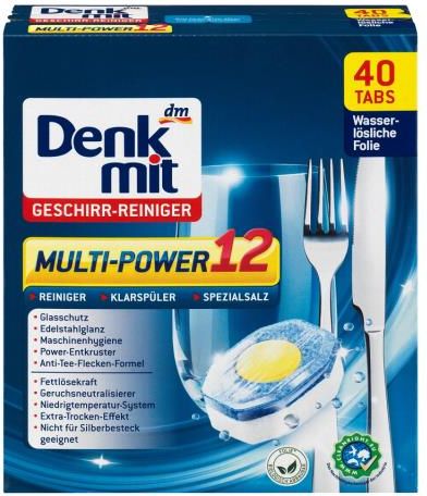 Denkmit Tabletki do zmywarki all in one (wszystko w jednym) 40 szt. Denkmit Geschirr-Reiniger Tabs Revolution 40 tabs - Tabletki do czyszczenia naczyń Denkmit Revolution łączą wszystkie ważne funkcje w jednej tabletce - zawierają już nabłyszczacz i specjalną sól. Tabletki do czyszczenia naczyń Multi-Power Revolution firmy Denkmit zapewniają optymalne rezultaty czyszczenia nawet w przypadku uporczywych zabrudzeń i są delikatne dla naczyń i dekoracji. Dzięki rozpuszczalnej w wodzie powłoce, która łatwo ulega biodegradacji, są one jednocześnie łatwe i praktyczne w użyciu – zapewniają idealną czystość i olśniewający połysk. Głęboki środek czyszczący: Silnie usuwa uporczywy brud Nabłyszczacz: zapobiega osadzaniu się wody i kamienia oraz zapewnia promienny połysk Sól specjalna: zapobiega osadzaniu się szkodliwego kamienia Ochrona szkła: Uszczelnia szkła i chroni przed korozją szkła Mocny odkamieniacz: Usuwa ciężkie osady i zaschnięte resztki jedzenia Efekt szybkiego suszenia: wspomaga suszenie naczyń i pozwala uniknąć kłopotów z ich późniejszym suszeniem Asystent pielęgnacji maszyny: Zintegrowana pielęgnacja zmywarki Ochrona stali nierdzewnej: zapobiega plamom i utrzymuje promienny połysk Neutralizator zapachów: Neutralizuje nieprzyjemne zapachy i zapewnia świeżość po każdym płukaniu System niskotemperaturowy: Skuteczne czyszczenie nawet w niskich temperaturach (od 40°C) Formuła szybkiego uwalniania: Nadaje się również do krótkich programów. Silny wobec plam z herbaty i kawy: Niezawodnie usuwa uporczywe plamy z herbaty i kawy Bez cynku: Mniej zanieczyszcza wodę dzięki recepturze niezawierającej cynku