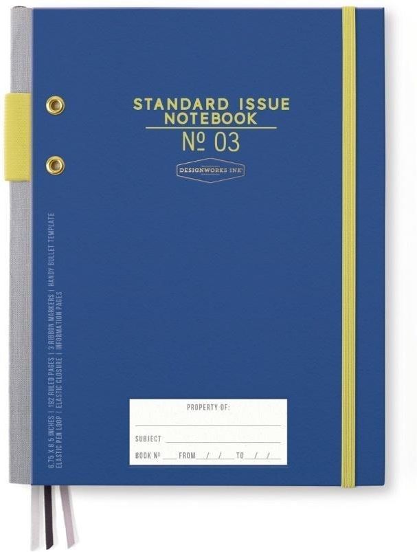Notatnik Standard Issue Cobalt & Citron | DESIGNWORKS INK To praktyczny prezent dla zorganizowanej kobiety. Notatnik ma twardą okładkę z gumką i miejscem na Twoje dane. 192 strony z nagłówkami dzień / miesiąc w rozmiarze 15 x 21 cm. Grzbiet owinięty tkaniną i akcent ze złotej folii, rozkłada się na płasko. Posiada strony z przydatnymi informacjami oraz linijkę wielofunkcyjną. Wydrukowano tuszami sojowymi na papierze bezkwasowym. Podlega recyklingowi.