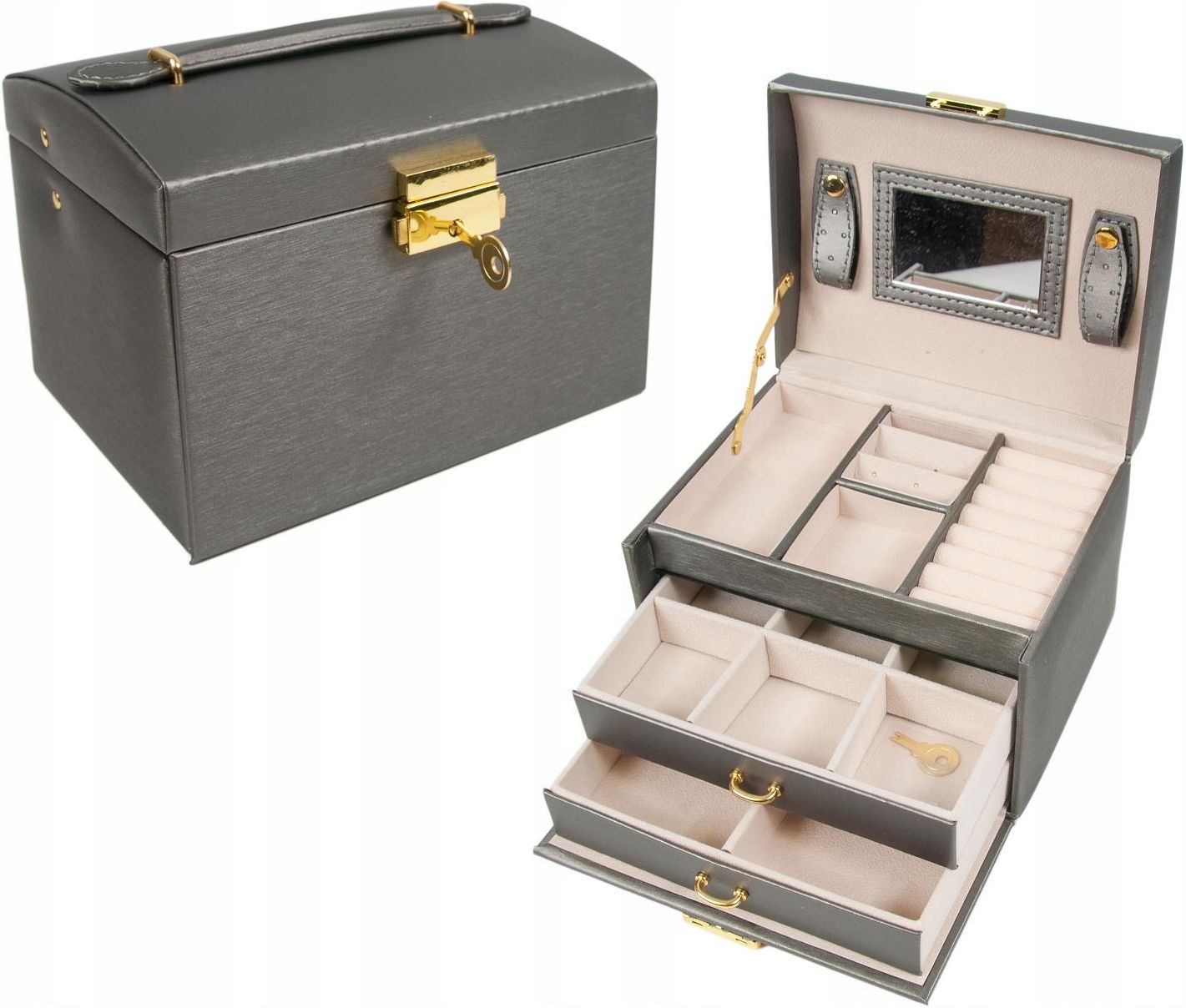 PREZENTUJEMY NOWOŚĆ I ABSOLUTNY HIT SATYNOWY KUFEREK SZKATUŁKA NA BIŻUTERIĘ NA TEJ AUKCJI KUPUJESZ KOLOR: SZARY (inne kolory dostępne na pozostałych aukcjach) Ciężko Ci utrzymać porządek? Nie wiesz gdzie pomieścić wszystkie kolczyki, bransoletki i zegarki? Od dziś to nie problem. Nasza szkatułka, pomoże Ci zapanować nad chaosem :) Szkatułka pomieści mnóstwo biżuterii. Idealnie sprawdzi się jako domowy organizer, a także ekspozytor na biżuterię. Eleganckie wykonanie i dbałość o szczegóły, to główne zalety pudełka. Został wykonany z wysokiej jakości skóry ekologicznej, dzięki czemu jest bardzo trwały i posłuży przez długi czas. KOLOR:SZARY Wymiary kuferka to ok. 17.5 cm x 14 cm x 13 cm Każdy kuferek we wnętrzu posiada małe lusterko. Kuferek zamykany jest na niewielki kluczyk który dołączony jest do zestawu. Organizer składa się z 3 poziomów w tym 2 szufladek. Najwyższe piętro szkatułki to idealne miejsce na pierścionki, kolczyki. Dodatkowo wieczko wyposażone zostało w lusterko. Piętro środkowe to przegródka na bransoletki. Szufladka jest przedzielona na pół. Najniższe piętro to szufladka, którą możemy samodzielnie dostosować do swoich potrzeb, dzięki wyjmowanym przekładkom. ZAMYKANY NA KLUCZYK Cały kuferek można zamknąć na kluczyk, dołączony do pudełka. RĄCZKA DO PRZENOSZENIA Walizeczka posiada zdobioną i przeszytą rączkę do przenoszenia, dzięki temu z łatwością zabierzemy go ze sobą np. w podróż. ZACHOWAJ PORZĄDEK Dobrze znamy codzienny bałagan jaki mamy przy ogromniej ilości biżuterii w domu. Nasz organizer pomoże się uporać z tym problemem. Dzięki pojemnikowi do przechowywania w kilka chwil twoje cenne skarby, odnajdą swoje miejsce, a szkatułka będzie pięknym dopełnieniem dekoracji sypialni lub innego pokoju. Kuferek pozwoli w doskonałym stylu zadbać o biżuterię, zapewniając jej ochronę przed uszkodzeniem, a także pięknie ją wyeksponuje. Wykorzystaj specjalnie zaprojektowany do tego celu produkt i ciesz się doskonale uporządkowanymi oraz zabezpieczonymi kosztownościami w jednym miejscu. Praktyczna szkatułka posiada 20 rożnych przegródek i wgłębień, dzięki którym zapanujesz nad porządkiem swojej kolekcji. Kuferek oprócz przegródek posiada także 2 wysuwane niezależnie szufladki. Przegródki mają różne rozmiary i sprawdzą się zarówno do chowania zegarków, bransoletek, łańcuszków, jak i kolczyków, a nawet monet czy pendrive z ważnymi danymi. Na środku znajduje się także lusterko idealne przy wkładaniu kolczyków lub innej biżuterii. Na drobniejsze przedmioty typu zawieszki, kolczyki „sztyfty” i pierścionki, doskonale posłużą przystosowane do tego przegródki w formie rolek, które stabilnie przytrzymują małe drogocenności. Paski z zatrzaskami umieszczone przy lusterku umożliwiają przechowywanie bransoletek, łańcuszków itp. zabezpieczając je przed zgubieniem. W paski można również wpiąć kilka pędzli do makijażu lub kolczyki, dzięki specjalnym dziurkom.
