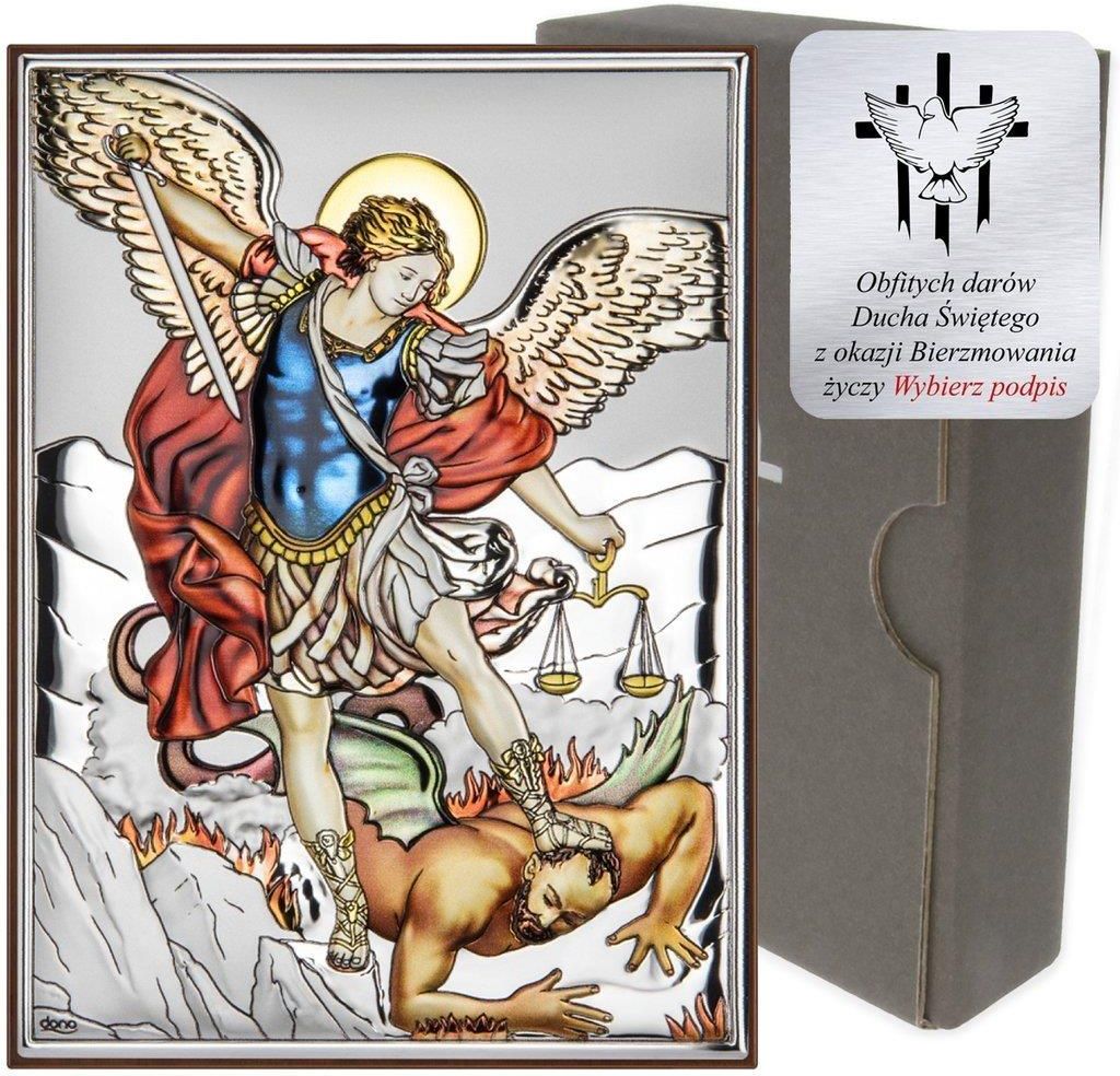 Obrazek srebrny z kolorowymi akcentami z wizerunkiem Michała Archanioła. Obrazek wyprodukowany został przez firmę Dono. Gwarantuje ona, iż przedmiot nabyty przez Państwa został wyprodukowany we Włoszech, zgodnie z kunsztem i tradycją obróbki metali szlachetnych. Obrazek wykonany jest z blachy aluminium pokrytej warstwą srebra. Całość zabezpieczona jest warstwą lakieru, która chroni przed czynnikami zewnętrznymi. Wpływa to na bezproblemowe użytkowanie bez potrzeby częstego czyszczenia. Obrazek można zarówno powiesić, jak i postawić na dołączonej podstawce. Do czyszczenia zalecamy używanie wyłącznie czystych, miękkich ściereczek, a w przypadku zabrudzeń letniej wody. Nie należy stosować detergentów, alkoholu ani znajdujących się w sprzedaży środków i ściereczek do czyszczenia srebra, gdyż mogą one uszkodzić warstwę ochronną.