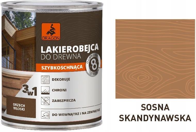 Dragon Lakierobejca do drewna Kolor: Sosna Skandynawska Pojemność: 700ml To wysokiej jakości produkt ochronno-dekoracyjny do zabezpieczenia drewna zarówno wewnątrz pomieszczeń jak i na zewnątrz. Dzięki zaawansowanej formule 3 w 1 idealnie sprawdzi się jako produkt, który impregnuje drewno, nadaje …