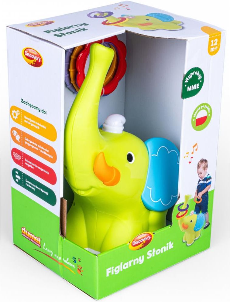 Zabawka, która bawi i uczy Sprawdź się w rzucaniu do celu i umieść wszystkie obręcze na słoniowej trąbie! Razem ze Słonikiem ćwicz celność i przekonaj się czy jesteś zwinniejszy od niego! Zabawa polega na wrzuceniu wprost na słoniową trąbę kolorowych obręczy, które znajdują się w zestawie. Żeby nie było tak łatwo, cel jest ruchomy, gdyż słonik przemieszcza się, jeżdżąc we wszystkich kierunkach. Naciśnij na czapeczkę słonika, słuchaj piosenki w języku polskim i… trenuj rzuty! Cechy zabawki: zabawka śpiewa w języku polskim w zestawie obręcze zabawa polega na wrzuceniu obręczy na trąbę słonika, który jeździ we wszystkich kierunkach wiek: od 12 miesiąca życia Producent Firma DUMEL od 1999 roku jest importerem zabawek i akcesoriów dla dzieci. Powstała z myślą o dzieciach, które są największym skarbem świata. Celem firmy jest, aby podczas zabawy zabawkami dziecko było zadowolone i uśmiechnięte, aby nasze zabawki angażowały do kreatywnej zabawy i rozbudzały w dzieciach potrzebę tworzenia. Każda zabawka firmy Dumel wykonana jest z najwyższej jakości surowców, odpowiada europejskim normom bezpieczeństwa oraz posiada certyfikat CE.