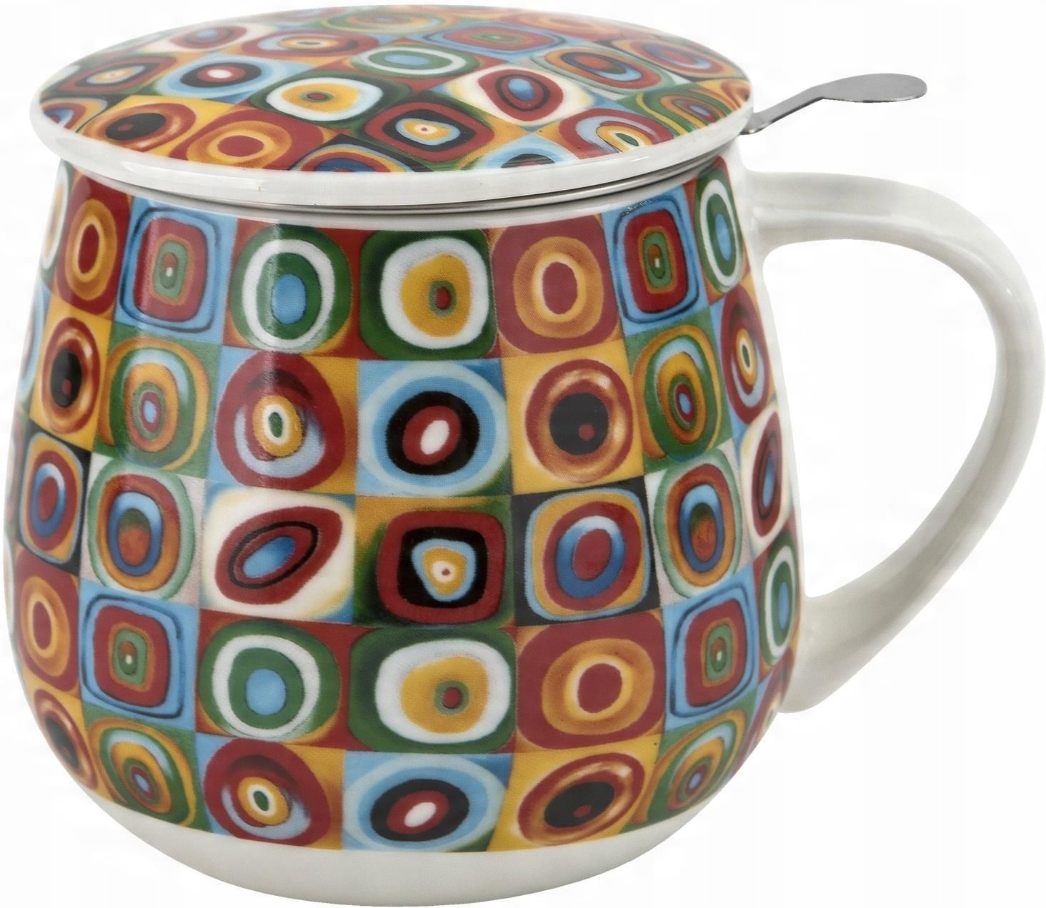 Kubek baryłka z zaparzaczem SQUARES WITH CIRCLES, W.Kandinsky Stylowy kubek z zaparzaczem i pokrywką, inspirowany kultowym dziełem Squares with Concentric Circles autorstwa Wassilego Kandinsky’ego. Wykonany z eleganckiej porcelany New Bone China , wyróżnia się kremowo-białym odcieniem z delikatnym połyskiem oraz wyjątkową trwałością. Wzór w formie kolorowej siatki z koncentrycznymi okręgami nawiązuje do eksperymentów Kandinsky’ego z kolorem i formą – artysta wierzył, że proste kształty mogą wyrażać emocje i odkrywać tajemnice kosmosu. Dynamiczne zestawienie barw nadaje kubkowi energetyczny, artystyczny charakter. Idealny do zaparzania ziół i herbaty liściastej W zestawie: zaparzacz ze stali nierdzewnej i dopasowana pokrywka Design inspirowany malarstwem abstrakcyjnym Ozdobne opakowanie – gotowy na prezent To nie tylko kubek – to codzienna chwila z herbatą w towarzystwie sztuki. Wassily Kandinsky (1866–1944) to rosyjski malarz i teoretyk sztuki, uznawany za jednego z ojców abstrakcjonizmu. Wierzył, że sztuka nie powinna ograniczać się do odwzorowywania rzeczywistości – według niego kolor i forma mogą samodzielnie wyrażać emocje oraz idee. To właśnie to podejście uczyniło go jedną z najbardziej wpływowych postaci w historii sztuki nowoczesnej. Jednym z jego najbardziej znanych dzieł jest Squares with Concentric Circles z 1913 roku. Choć nie jest to klasyczny obraz, lecz studium wykonane akwarelą, gwaszem i kredką na papierze, kompozycja ta na stałe zapisała się w kanonie sztuki abstrakcyjnej. Oryginał znajduje się w Städtische Galerie im Lenbachhaus w Monachium. Dziś ten energetyczny, kolorowy motyw należy do najczęściej reprodukowanych i najchętniej wybieranych wzorów w świecie sztuki użytkowej – pełen kontrastów i życia, inspiruje i zachwyca w każdej formie. Szerokość (cm): 12,5 Wysokość (cm): 10 Długość/głębokość (cm): 10 Waga (kg): 0,47 Pojemność (ml): 430 Kolor: wielokolorowy Można myć w zmywarce: Tak Można używać w mikrofali: Tak Materiał wykonania: Porcelana nr katalogowy (336714)