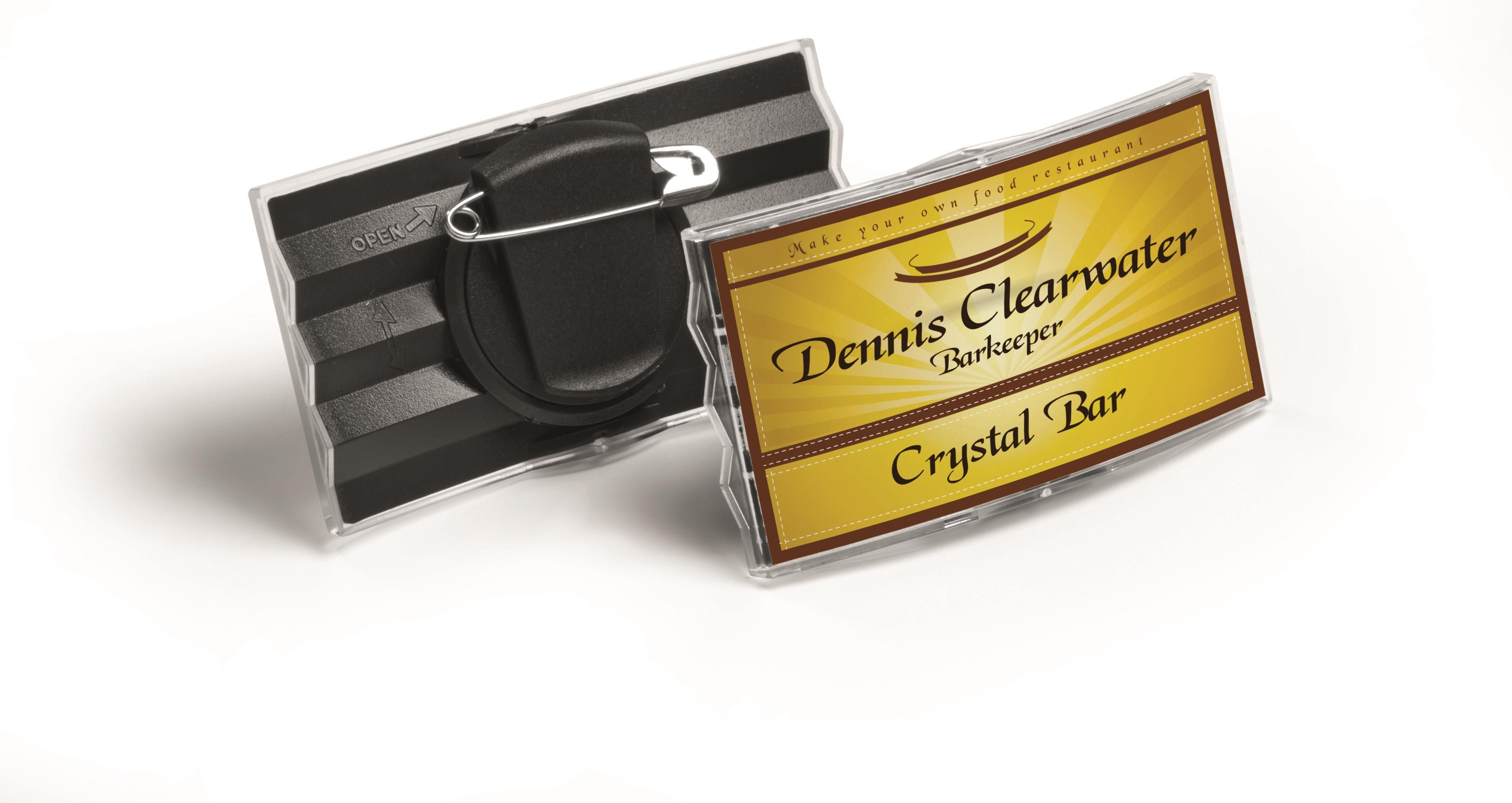Identyfikator 40x75 mm z kombi-klipem Atrakcyjny kształt nadaje wypukłe, przezroczyste okienko z akrylu. Może być przypięty w pionie lub w poziomie. Elegancki tył z tworzywa sztucznego zapinany na wytrzymały klips z tworzywa z agrafką. Wymiary: 40 x 75 mm Opakowanie 25 szt