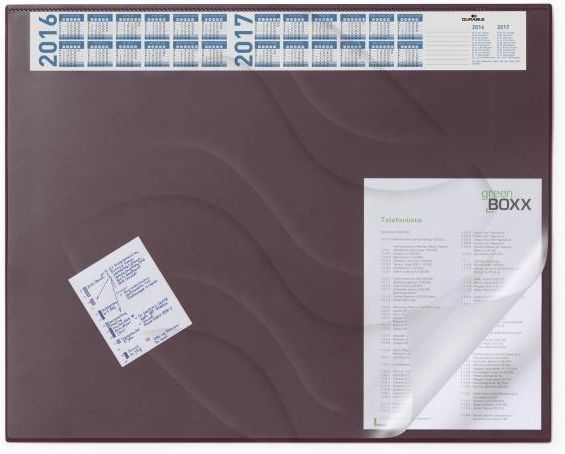 Podkład na biurko z kalendarzem 650 x 520 Podkłady na biurko DURABLE są dostępne w wielu formatach i dzięki temu mogą być łatwo dopasowane do indywidualnych wymagań. Wszystkie podkłady są wygodne w użyciu i dostępne w wielu stylowych wzorach pasujących do każdego miejsca pracy. • Podkład na biurko z przezroczystą nakładką. • Z małym kalendarzem na 4 lata • Antypoślizgowy • Wymiary: 650 x 520 mm (S x W)