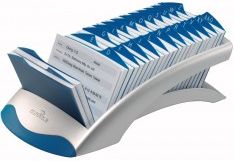 Kartoteka stojąca Durable Telindex Desk Vegas na wpisy numerów telefonów i adresów. 500 kart do obustronnego opisania o formacie 72 x 104 mm. Alfabetyczne, 25-cio częściowe przekładki od A-Z. Opis kart możliwy poprzez ich łatwe wyjęcie i włożenie. Wymiary: 245 x 131 x 67 mm (S x W x G).