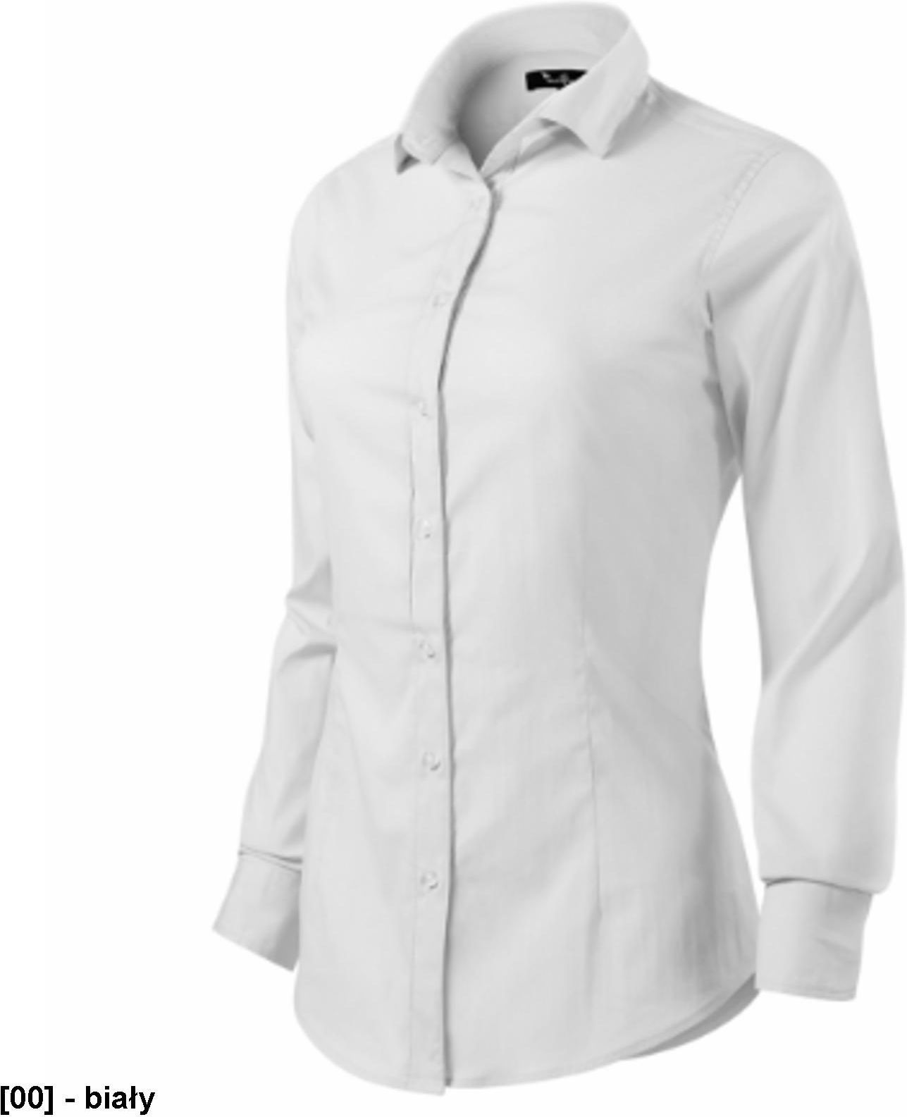 Dynamic Dopasowany krój z bocznymi szwami. Podwójny karczek. Zaszewki podkreślające damska figurę. Kołnierzyk koszulowy. Części przednie wykończone plisą. Długie rękawy ze ściętymi mankietami i 2 guzikami. Perłowe guziki w kolorze materiału (1 zapasowy). Zaokrąglony dół. Specyfikacje Gramatura 110 g/m² Skład materiału 73 % bawełna 24 % polyamid 3 % elastan Prać w 30 °C Minimalny odbiór 1 szt Metoda znakowania odzieży haft, nadruk transferowy Szt. w woreczku 1 szt Metka tkana