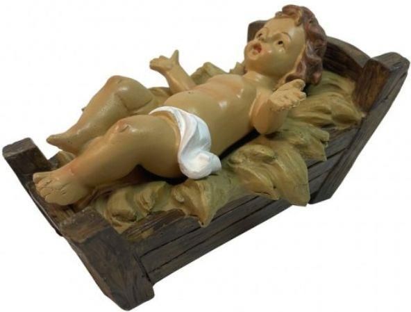 Figurka przedstawiająca Dzieciątko Jezus w żłóbku. Wykonana z polyresinu (polyresin to mieszanka żywic, mączek alabastrowych i ceramicznych). Długość: 14,5 cm