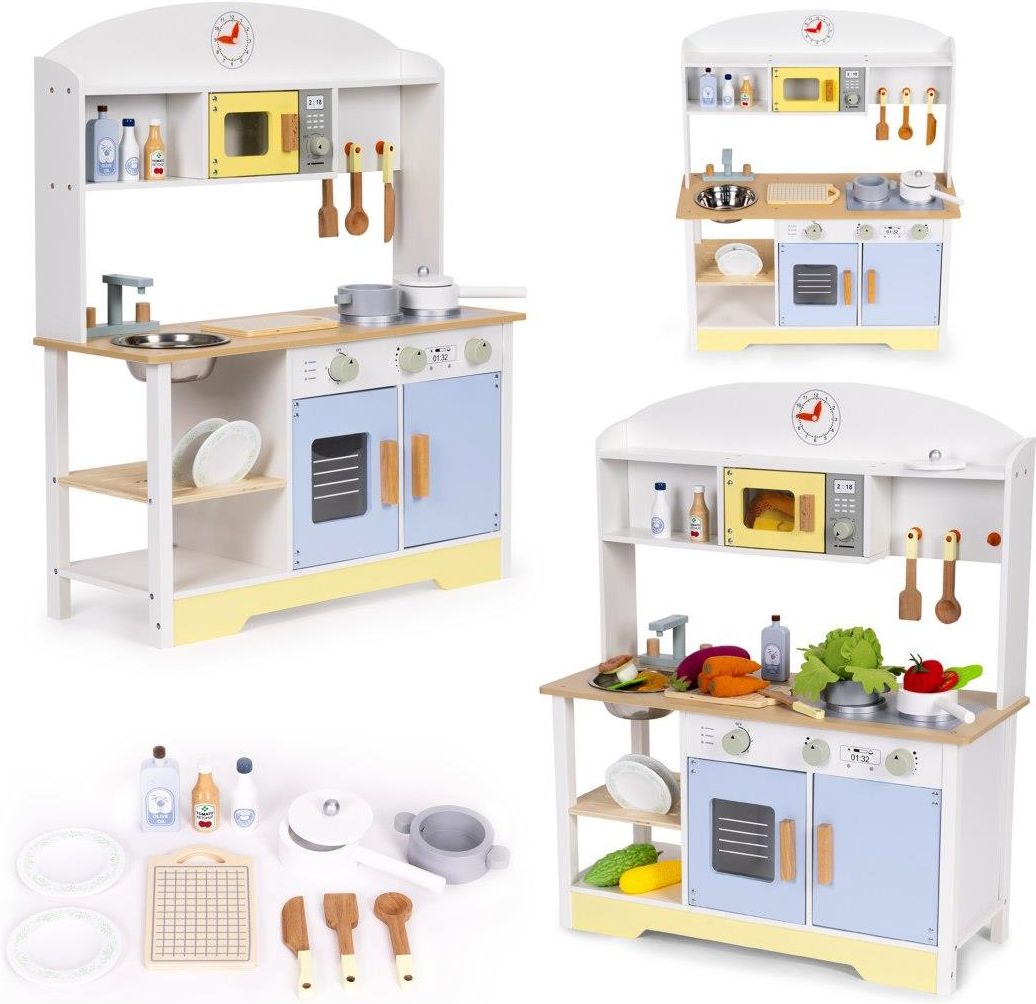 KUCHNIA DLA DZIECI ECOTOYS Dla dzieci powyżej 3 roku życia Stabilna konstrukcja z płyty MDF Piekarnik, zlew, pralka, palniki, mikrofala, zegar Pokrętła wydające dźwięk klikania Otwierane szafki 12 drewnianych akcesoriów w zestawie Rozwija kreatywność i wspiera zabawę w odgrywanie ról Produkt marki …