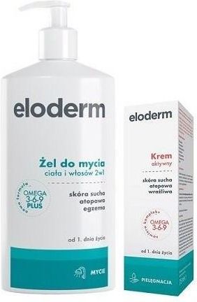 Eloderm Żel do mycia ciała i włosów 2w1 400ml + Krem Aktywny Od 1 Dnia Życia 75ml Wszechstronna pielęgnacja skóry nadmiernie suchej, atopowej i nadwrażliwej na czynniki zewnętrzne. Co to jest Eloderm krem aktywny i w jakim celu się go stosuje? Krem Aktywny Eloderm to specjalistyczny preparat emoliencyjny o pojemności 75ml do pielęgnacji mniejszych partii ciała, który dogłębnie nawilża i natłuszcza nadmiernie suchą skórę łagodząc podrażnienia i uporczywe odczucie świądu. Dzięki bogatemu kompleksowi składników aktywnych nie tylko pielęgnuje, ale również wspomaga odbudowę naturalnej bariery ochronnej naskórka. Zapewnia zdrowy wygląd i funkcjonowanie nawet dla nadwrażliwej skóry. Krem Aktywny Eloderm zawiera w swoim składzie Omega Butter – masło w 100% pochodzenia naturalnego. W jego skład wchodzi zimnotłoczony olej z nasion brazylijskiego drzewa Sacha Inchi oraz frakcja z toskańskiej oliwy z oliwek. Składnik ten charakteryzuje się najwyższą zawartością wielonienasyconych kwasów tłuszczowych (NNKT) Omega 3-6-9 pośród wszystkich olejów jadalnych. Kwasy te poprawiają nawilżenie skóry redukując transepidermalną utratę wody (TEWL). Jak stosować? Niewielką ilość Kremu Aktywnego Eloderm dokładnie rozprowadzić na oczyszczoną powierzchnię skóry i pozostawić do wchłonięcia. Do stosowania na dzień i na noc. Unikać kontaktu z okolicą oczu. Co zawiera? Skład: Olej canola, Omega Butter, Masło shea, Olej macadamia, Hialuronian sodu, Urea, Olej kukurydziany Opis produktu Eloderm żel do mycia ciała i włosów 2w1, delikatnie oczyszcza włosy i ciało, nie naruszając naturalnej bariery ochronnej skóry. Działa łagodząco, zmniejsza dolegliwości suchej skóry takie jak: świąd, szorstkość, łuszczenie i zaczerwienienie. Usuwa objawy ciemieniuchy. Przywraca skórze równowagę fizjologiczną. Zawarte w składzie łagodne detergenty nie powodują wysuszenia skóry. Sprawia, że włosy stają się gładkie, miękkie i łatwiej się rozczesują. Żel nie szczypie w oczy i nie powoduje podrażnienia spojówek. Zawarty w składzie kompleks Omega 3-6-9 Plus stworzony z 7 olejków: słonecznikowego, kokosowego, lnianego, awokado, arganowego, makadamia i oliwkowego, posiada właściwości silnie nawilżające, regenerujące i natłuszczające skórę. Prebiotyk przywraca skórze komfort oraz wspiera prawidłową mikroflorę. D-pantenol i alantoina regenerują, łagodzą i koją. Zastosowanie Codzienna pielęgnacja skóry suchej, atopowej, swędzącej oraz ze skłonnością do egzemy i alergii. Żel jest odpowiedni do pielęgnacji skóry z AZS w okresie remisji, jak i nasilenia zmian skórnych. Dla dzieci i dorosłych. Do stosowania od 1. dnia życia. Sposób użycia Niewielką ilość żelu nanieść na dłonie, wmasować w ciało i wilgotną skórę głowy aż do wytworzenia piany, następnie dokładnie spłukać wodą. W razie konieczności czynność powtórzyć. Składniki (INCI) Aqua, Disodium Cocoyl Glatamate, Glycerin, Citric Acid, Inulin (inulina), Panthenol (pantenol), Allantoin (alantoina), Helianthus Annuus Seed Oil, Cocos Nucifera Oil (olej kokosowy), Linum Usitatissimum Seed Oil (olej lniany), Persea Gratissima Oil (olej z awokado), Argania Spinosa Kernel Oil (olej arganowy), Macadamima Ternifolia Seed Oil (olej makadamia), Olea Europaea Fruit Oil (oliwa z oliwek), Rosmarinus Officinalis Leaf Extract (wyciąg z rozmarynu), Fructose, Glucose, Cellulose Gum, Xanthan Gum, Cellulose, Sodium Benzoate, Potassium Sorbate. Dodatkowe informacje Produkt przebadany dermatologicznie i okulistycznie pod nadzorem lekarza neonatologa. Poznaj pozostałe produkty