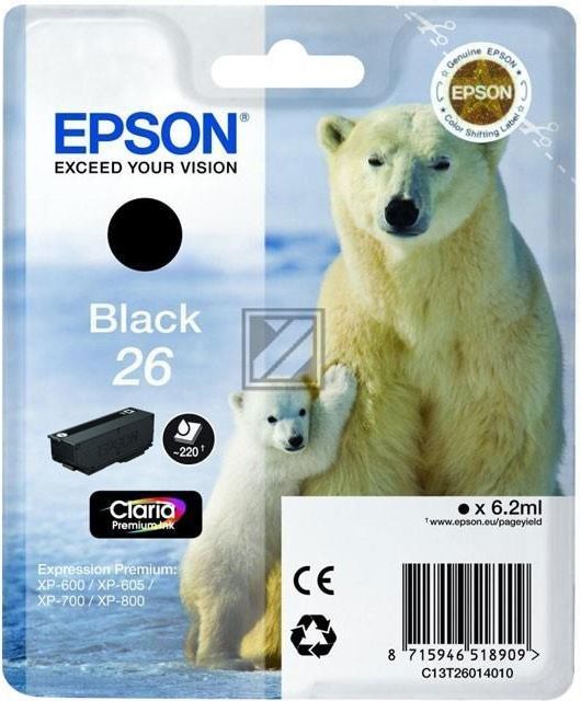 Atrament 26 Niedźwiedź polarny Claria Premium, pojedyncze opakowanie, czarny Atrament Claria Premium tworzy dokumenty z ostrym i wyraźnym tekstem oraz nadzwyczajne, błyszczące zdjęcia ze szczegółami i bogatymi, żywymi kolorami. Doskonała równowaga w nowoczesnym domu.  Atrament Claria Premium …