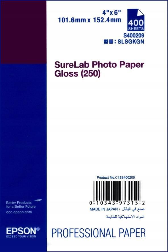Epson SureLab Gloss 250g 10x15 400 ark. C13S400209 Specfyfikacja: - format: 10x15 cm - gramatura: 250 g/m2 - ilość arkuszy: 400 - wykończenie: błyszczące
