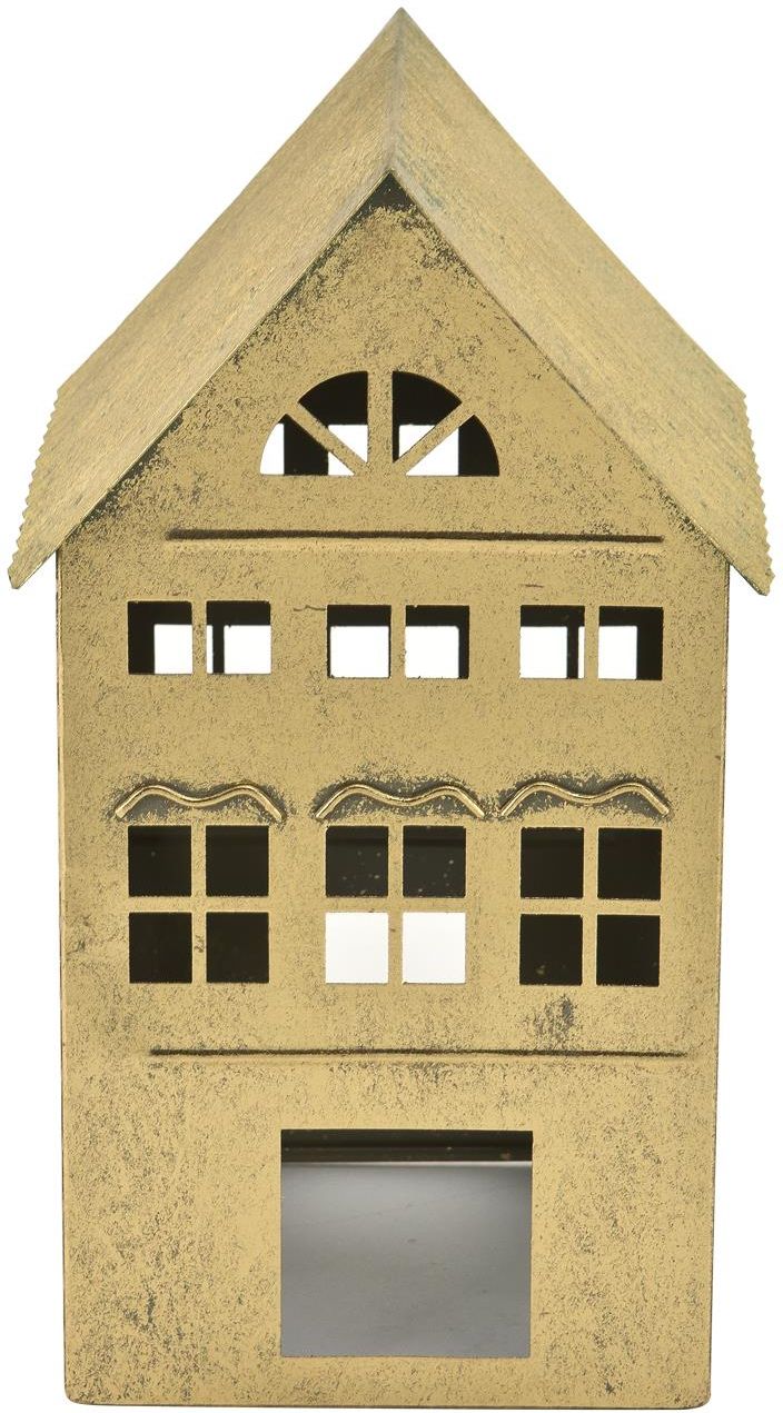Metalowy domek w kolorze złotym. Doskonały do świątecznych aranżacji. Nie tylko przyozdobi wnętrze domu, ale wniesie również bożonarodzeniowy klimat. Udekoruje stół, meble czy witryny, a także inne domowe zakamarki dodając im uroku i ciepłej atmosfery. Konstrukcja domku pozwala umieścić w nim np. niewielki lampki ledowe. Ich blask rozświetli wnętrze domku. Światło będzie wydobywać się zarówno z licznych okien, jak i otwartych drzwi. Domek jest otwarty od spodu co daje mu szereg zastosowań. Domek jest dość lekki, ale bardzo stabilny. Jego podstawa o wymiarach 16x16 cm pozwoli umieścić go bez problemu na każdej otwartej półce ściennej. A wysokość 28 cm sprawi, że z pewnością zostanie zauważony.
