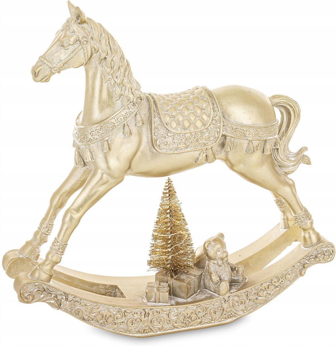 KOŃ NA BIEGUNACH, DEKORACJA OZDOBA, NA PREZENT Koń na biegunach 172553 Wyjątkowa dekoracja do domu - koń na biegunach. Prezentowany model wykończono w kolorystyce złotej. Koń na biegunach z zamierzenia jest stylizowany na stary, stąd liczne na nim przetarcia, postarzenia. Jest idealną dekoracją świąteczną oraz do pokoju Rozmiar: 28,5x7,5x29 Waga: 1.3 Kg Kolor: złoty Materiał: tworzywo sztuczne Opis: zasilanie:2xAAA