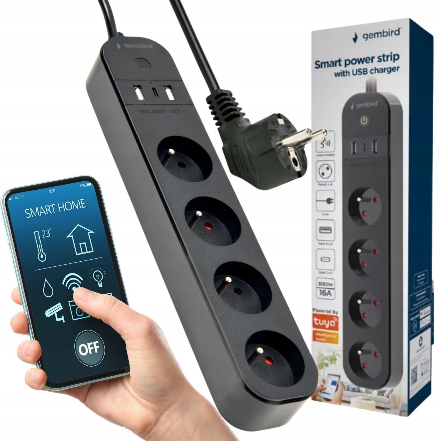 Inteligentna listwa zasilająca WiFi Tuya z USB i pomiarem mocy 4 gniazda (czarna) TSL-PS-F4U-02Szukasz rozwiązania, które pozwoli sterować zasilaniem urządzeń w domu z telefonu i jednocześnie kontrolować zużycie prądu? Inteligentna listwa zasilająca WiFi Tuya TSL-PS-F4U-02 to nowoczesna listwa smart z 4 gniazdami 230V, portami USB-A i USB-C oraz funkcją pomiaru energii. Dzięki aplikacji Smart Life / Tuya Smart możesz zdalnie włączać i wyłączać sprzęt, ustawiać harmonogramy pracy oraz tworzyć sceny automatyzacji w inteligentnym domu. To idealny wybór do salonu, biura, stanowiska komputerowego, pokoju dziecka oraz miejsc, gdzie chcesz wygodnie zarządzać energią i zwiększyć bezpieczeństwo. Sterowanie z telefonu listwa smart WiFi do inteligentnego domu Listwa obsługuje sieć WiFi 2,4 GHz (802.11 b/g/n), dlatego działa bez dodatkowej centralki. Po konfiguracji w aplikacji otrzymujesz pełną kontrolę nad zasilaniem urządzeń w domu także wtedy, gdy jesteś poza domem. Najważniejsze funkcje sterowania Zdalne włączanie i wyłączanie urządzeń przez smartfon Obsługa każdego gniazda osobno (4 niezależne kanały) Harmonogramy (timer) i automatyczne scenariusze pracy Możliwość udostępnienia listwy innym domownikom Pomiar zużycia energii kontrola mocy i oszczędność prądu Wbudowany pomiar mocy i energii pozwala sprawdzać pobór prądu podłączonych urządzeń. Dzięki temu możesz szybko zidentyfikować sprzęt, który zużywa najwięcej energii, ograniczyć działanie w trybie czuwania i realnie obniżyć rachunki. Korzyści z pomiaru energii Monitoring poboru mocy urządzeń (np. komputer, TV, konsola, router) Kontrola kosztów zużycia prądu w domu Łatwiejsze planowanie oszczędzania energii Wykrywanie zbędnych strat prądu w standby 4 gniazda 230V każdą wtyczkę sterujesz osobno Inteligentna listwa zasilająca 4 gniazda daje możliwość niezależnego sterowania każdym podłączonym urządzeniem. Możesz wyłączyć telewizor i konsolę, zostawiając działający router lub ładowarkę. Przykłady zastosowań Smart listwa do TV / kina domowego Listwa do komputera, monitora i drukarki w biurze Listwa do konsoli i sprzętu gamingowego Listwa do automatyki domowej (lampki, oczyszczacz, wentylator) USB-A i USB-C wygodne ładowanie bez ładowarki Listwa jest wyposażona w 2 porty USB typu A i 1 port USB typu C, dzięki czemu naładujesz telefon, słuchawki, smartwatch, lampkę LED czy powerbank bez dodatkowych zasilaczy. Parametry USB 2× USB-A + 1× USB-C maks. łącznie: 12 W (5V / 2,4A) Tuya Smart / Smart Life kompatybilność z systemem smart home Listwa działa w ekosystemie Tuya, dlatego można ją łatwo zintegrować z innymi urządzeniami inteligentnego domu. To świetny wybór dla osób, które budują smart home lub mają już urządzenia Tuya (żarówki, kamery, czujniki, gniazdka). Obsługiwane aplikacje: Tuya Smart Smart Life (Tuya) Informacje o produkcie Liczba gniazd typu E 4 Długość przewodu 1.5 m Wtyczka Europejska (French) Pozostałe porty we/wy 3 x USB Kolor Czarny Wymiary 294 × 57 × 42 mm Waga 0.56 kg Pozostałe parametry WiFi: 802.11 b/g/n, 2,4 GHz Napięcie: 220240 V AC, 50 Hz Maks. prąd: 16 A Maks. obciążenie: 3680 W Bezpiecznik termiczny: 125°C USB: 2× USB-A + 1× USB-C USB output: 5V / 2,4A / 12W max łącznie Pobór mocy standby: < 0,5 W Oznaczenia