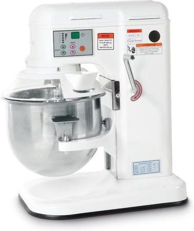 Mikser planetarny, miesiarka do ciasta lekkiego, 6,65 l, 0.658 kW HENDI 226261 Profesjonalny mikser planetarny HENDI 226261 to urządzenie przeznaczone do wyrabiania lekkich ciast, które sprawdzi się zarówno w restauracjach, cukierniach, jak i domowych kuchniach. Wyróżnia się dużą pojemnością dzieży oraz solidną, aluminiową konstrukcją zapewniającą niezawodność w codziennej pracy. Dzięki przemyślanej budowie i zaawansowanym zabezpieczeniom, mikser gwarantuje bezpieczeństwo i komfort użytkowania nawet podczas intensywnej eksploatacji. Najważniejsze cechy Wytrzymała konstrukcja z aluminium – Obudowa wykonana ze stopu aluminium malowanego na biało zapewnia trwałość, odporność na uszkodzenia oraz estetyczny wygląd, który łatwo wkomponuje się w każdą kuchnię. Pojemna dzieża ze stali nierdzewnej – Dzieża o pojemności 6,65 litra została wykonana z wysokiej jakości stali nierdzewnej AISI 304, co zapewnia odporność na korozję i łatwość utrzymania czystości. Intuicyjne sterowanie cyfrowe z timerem – Panel sterowania umożliwia precyzyjne ustawienie czasu pracy do 30 minut, co pozwala na dostosowanie pracy miksera do indywidualnych potrzeb użytkownika. Specyfikacja techniczna Rodzaj ciasta: lekkie – urządzanie przeznaczone do wyrabiania ciast o lekkiej konsystencji. Wymiary całkowite: 33,6 x 46 x 51,8 cm – kompaktowe rozmiary pozwalają na wygodne ustawienie miksera w kuchni. Moc: 0,658 kW – odpowiednia moc silnika wspomaga szybkie i efektywne mieszanie składników. Pojemność dzieży: 6,65 l – umożliwia wyrabianie większych ilości ciasta jednorazowo. Zasilanie: 230 V – uniwersalne zasilanie dostosowane do standardowych gniazdek elektrycznych. Typ dzieży: ruchoma (góra-dół) – ułatwia obsługę oraz opróżnianie dzieży po zakończonej pracy. Waga: 18 kg – stabilna konstrukcja zapewnia bezpieczeństwo podczas użytkowania. Funkcjonalność i bezpieczeństwo w codziennej pracy Mikser planetarny HENDI został wyposażony w system zabezpieczający, który uniemożliwia uruchomienie urządzenia w przypadku podniesienia osłony lub nieprawidłowego ustawienia dzieży. Osłona zabezpieczająca wykonana z trwałego tworzywa sztucznego chroni użytkownika przed przypadkowym kontaktem z mieszadłem podczas pracy. Mikser posiada wały osadzone w łożyskach kulkowych, dzięki czemu pracuje płynnie i cicho. Przekładnie wykonane ze stali stopowej oraz miedziane komponenty zapewniają długą żywotność i niezawodność działania nawet w warunkach intensywnej eksploatacji. Praktyczne akcesoria i wygoda użytkowania W komplecie z mikserem znajdują się trzy aluminiowe akcesoria: rózga, mieszadło oraz hak do ciasta. Taki zestaw umożliwia łatwe i wszechstronne zastosowanie urządzenia – od ubijania, przez mieszanie, aż po wyrabianie ciasta. Intuicyjne sterowanie elektroniczne z funkcją timera pozwala na zaprogramowanie pracy miksera, co jest szczególnie przydatne w profesjonalnych kuchniach oraz podczas przygotowywania większych ilości wypieków.