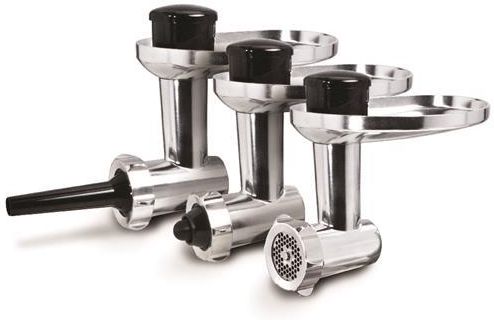 Opis produktu: W zestawie: 3 sitka (3 mm, 4,5 mm i 8 mm) 2 nakładki do kiełbas 1 nasadka do kebbe Sitka i nakładki ze stali nierdzewnej. Parametry techniczne: Wymiary [mm]: 160x250x250 Średnica tarcz [mm]: 60