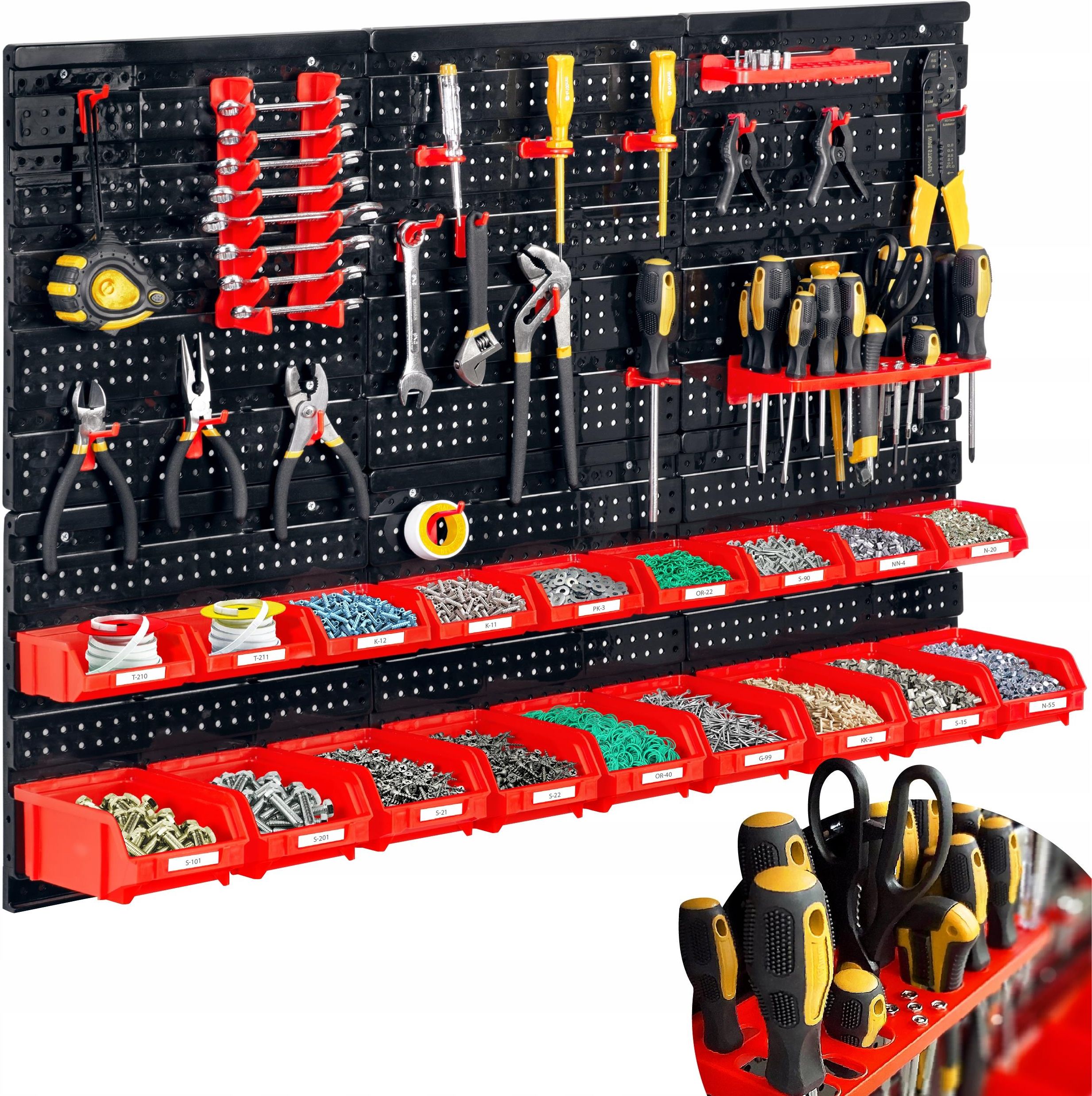 Tablica warsztatowa na narzędzia marki HUMBERG Oszczędzaj miejsce w warsztacie i utrzymuj porządek z łatwością. Tablica naścienna 96 x 76 cm zaprojektowana specjalnie do użytku warsztatowego – idealna do przechowywania i segregacji narzędzi oraz akcesoriów. Sprawdzi się zarówno w profesjonalnym serwisie, jak i w przydomowym garażu. Główne cechy wysoka jakość i wytrzymały materiał, aż 43 dodatki typu kuwety/haczyki/półki/uchwyty, panele modułowe — dopasuj do budowy twojego warsztatu, dowolne rozmieszczenie — pełna customizacja. Tablica warsztatowa z kompletnym zestawem uchwytów i pojemników to niezbędny element każdego warsztatu. Dzięki różnym dodatkom ze wzmocnionego tworzywa zmieścisz na niej komplet narzędzi. Wygodnie chwyć i odłóż na miejsce po pracy. Duży zestaw! 6 perforowanych paneli modułowych i aż 43 dodatkowe pojemniki, uchwyty, półki i haki. Dowolnie rozmieść dodatki na tablicy i ciesz się maksymalną funkcjonalnością. Wytrzymałe materiały - trwałość na lata. Zestaw zawiera 9 małych (9,5 x 10 x 5 cm) i 9 dużych (16 x 10 x 7,3 cm) kuwetek. Małe kuwetki świetnie nadają się do drobnych akcesoriów, jak śruby czy nakrętki. Duże kuwetki idealnie przechowują wkręty, wiertła oraz inne większe elementy. Dzięki temu zestawowi zachowasz porządek w warsztacie. Zestaw zawiera 1 półkę o wymiarach 23 x 9 cm oraz 1 półkę o wymiarach 17 x 5 cm. Większa półka doskonale sprawdza się do przechowywania nasadek i innych akcesoriów warsztatowych. Mniejsza półka jest idealna do trzymania narzędzi, takich jak wkrętaki, wiertła czy małe narzędzia ręczne. Te półki pomogą utrzymać porządek w Twoim warsztacie. Zestaw zawiera 16 uchwytów i haków oraz 1 zestaw uchwytów na klucze. Uchwyty i haki umożliwiają zawieszenie narzędzi, takich jak szczypce, młotki czy wkrętaki, zapewniając porządek w warsztacie. Zestaw uchwytów na klucze pozwala na łatwe przechowywanie kluczy, zapewniając ich wygodne i bezpieczne trzymanie w zasięgu ręki. Ten zestaw to doskonałe rozwiązanie do organizacji narzędzi w każdym warsztacie. Modułowa budowa i łatwy montaż Tablica narzędziowa posiada modułową konstrukcję, dzięki której możesz dowolnie łączyć panele i dostosować układ do swoich potrzeb. Prosty montaż pozwala na szybkie i wygodne połączenie poszczególnych elementów, a różnorodne kombinacje zapewniają elastyczność w organizacji przestrzeni roboczej. Dopasuj tablicę do swoich potrzeb i twórz idealny porządek w warsztacie! Solidne materiały i wysoka jakość detali Tablica została zaprojektowana z myślą o wyjątkowej trwałości. Wykonany ze wzmocnionego tworzywa zapewnia niezawodność przez długie lata użytkowania. Wysokogatunkowe perforowane panele gwarantują wytrzymałość, a duża powierzchnia robocza pozwala na komfortowe przechowywanie narzędzi i akcesoriów. Zapewnia wygodę i łatwość użytkowania w każdej przestrzeni roboczej. W zestawie znajdziesz uniwersalne kołki rozporowe do montażu Kołki rozporowe w zestawie są idealne do montażu na różnych powierzchniach, takich jak: Beton Cegła Drewno Blacha Dzięki solidnej konstrukcji kołki zapewniają mocne i stabilne mocowanie w tych materiałach, gwarantując niezawodność i bezpieczeństwo montażu. Zostań mistrzem w swoim warsztacie – perfekcyjna organizacja narzędzi.