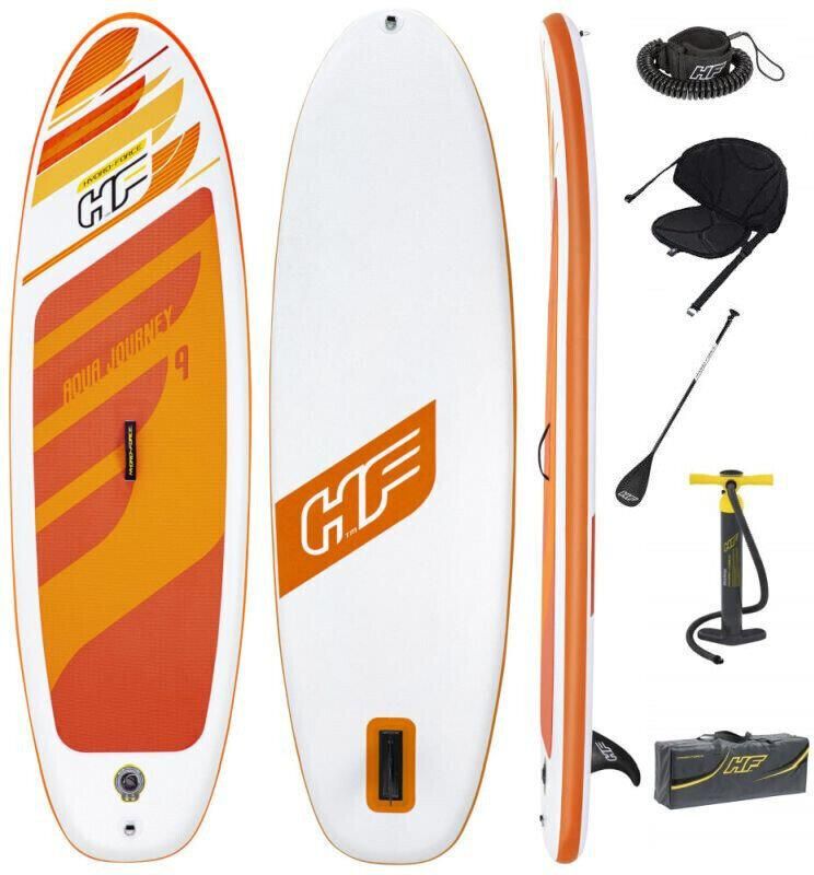 Zestaw sup Hydro Force Aqua Journey 10' 2021Hydro Force Aqua Journey 2021 to kompletny zestaw sup w którym znajdziesz wszystko co jest niezbędne do rekreacyjnego pływania z wiosłem na stojąco. Aqua Journey to najmniejszy paddleboard w ofercie tego producenta - bardzo dobra opcja dla młodych i lekkich paddleboardzistów. To deska typu allround czyli wszechstronna i bardzo uniwersalna konstrukcja, która charakteryzuje się wysoką stabilnością i łatwością manewrowania. Dwuwarstwowy materiał PVC w połączeniu z ciśnieniem roboczym 15PSI sprawiają że deska jest sztywna, trzyma swój kształt i jest również wytrzymała. HF Aqua Journey będzie odpowiednia do rekreacyjnego pływania dla osób o wadze do 60kg. To dobra propozycja dla lżejszych osób które chcą rozpocząć przygodę z paddleboardingiem. Hydro Force to marka należąca do Bestway czyli światowego giganta w produkcji basenów ogrodowych i innych dmuchanych zabawek do wody. Deski sup tej marki odznaczając się bardzo dobrym wykonaniem i bezawaryjnością. Relacja ceny do jakości jest w tym przypadku bardzo dobra.Specyfikacja Hydro Aqua Journey 9'Długość: 274 CMSzerokość: 76 CMWysokość: 12 CMWyporność: 208 LObciążenie: 80 KGWaga deski: 6,8 KGDzięki technologii Drop-stitch Hydro Force Aqua Journey po napompowaniu jest twarda i sztywne. Unikalna konstrukcja wnętrza deski sprawia że po napompowaniu deska staje się niemal tak sztywna jak to jest w przypadku desek "twardych". Cała tajemnica tkwi w tysiącach poliestrowych włókien które tworzą rdzeń deski pompowanej (1). Po wypełnieniu wnętrza deski powietrzem włókna prostują się tworząc solidny stelaż. Rdzeń deski osłonięty jest po obwodzie pasem materiału PVC (4) a następnie pokryty główną warstwą PVC. W tym modelu dno i pokład wykonany jest z dwuwarstwowego PVC. Boczne wzmocnienia obrysowe z wytrzymałego nylonu (3) również dodają desce sztywności. Pokład pokryty jest pianką EVA (5), która jest antypoślizgowa i zapewnia komfort.W zestawie z deską Hydro Force Aqua Journey otrzymasz:Torba / plecakPraktyczna torba / plecak w której bez problemu zmieścisz deskę, pompkę i wiosło.PompkaJednokierunkowa pompka z manometrem z którą łatwo i szybko napompujesz deskę do zalecanego ciśnienia.LeashSmycz którą podczas pływania przypinamy z jednej strony do kostki lub łydki a z drugiej do deski. W razie upadku deska Ci nie odpłynie.Aluminiowe wiosłoTrzyczęściowe wiosło aluminiowe z płynną regulacją długości. Długość wiosła można regulować w zakresie 167cm - 217cm.Zestaw naprawczyZestaw naprawczy składający się z dwóch łatek z pcv oraz klucza do wykręcenia zaworu.Wodoodporne etuiW prezencie dorzucamy wodoodporne etui na telefon, dokumenty lub inne drobne rzeczy których nie chciałbyś zamoczyć podczas pływania.Aquabag 2LW prezencie otrzymasz wodoszczelny worek żeglarski z PVC o pojemności 2l. Zmieścisz do niego telefon, portfel, dokumenty i inne drobne rzeczy.Jeżeli stoisz przed wyborem swojej pierwszej deski sup i nie do końca wiesz na co powinieneś zwrócić uwagę to z myślą o Tobie przygotowaliśmy krótki SUP poradnik. Z poradnika dowiesz się jakie są rodzaje desek, jakie jest ich przeznaczenie oraz jakie są najważniejsze parametry decydujące o właściwościach deski. SUP poradnik dla początkujących...