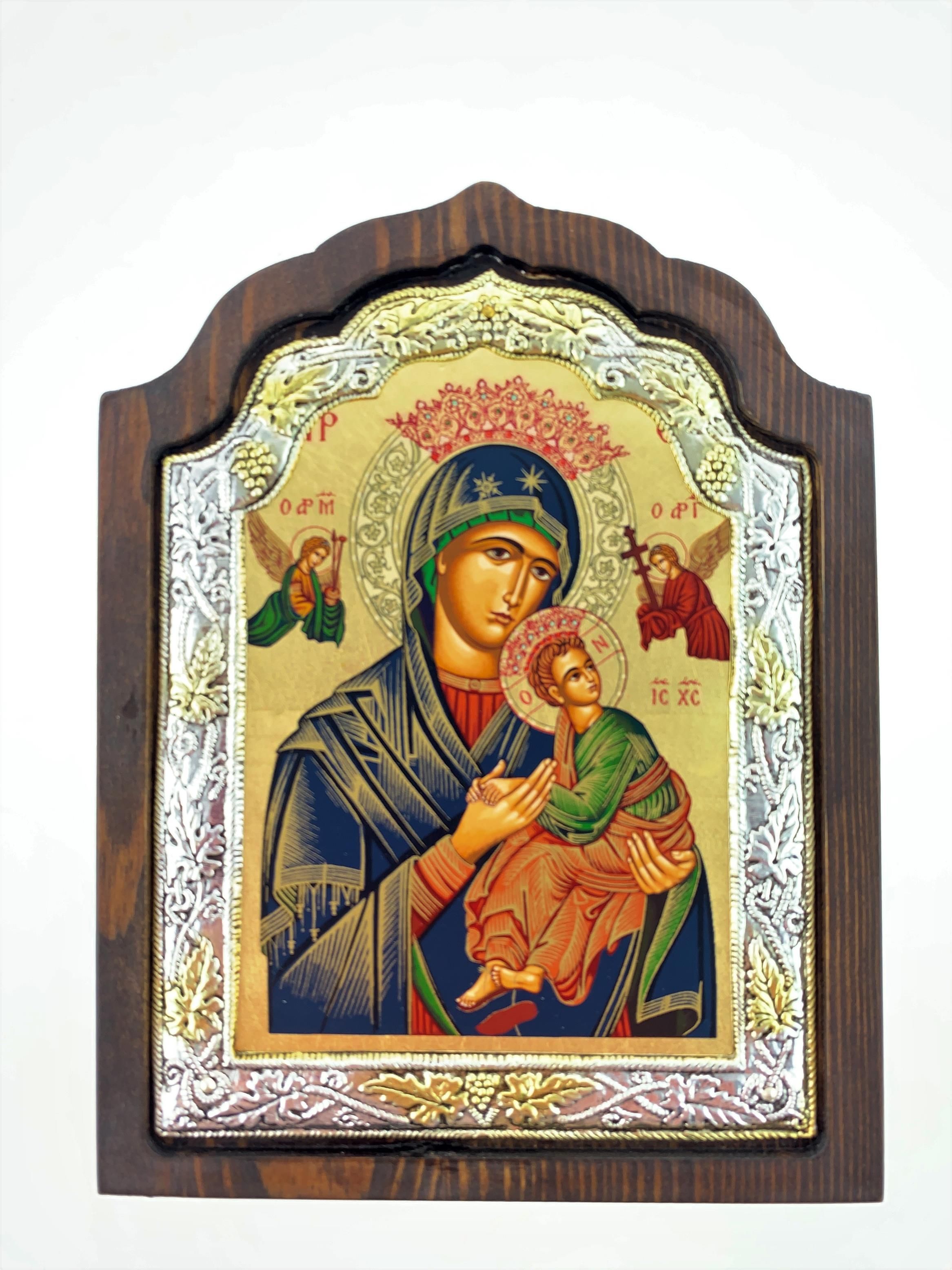 Ikona grecka na desce, w etui Rękodzieło prosto z Grecji. Metalowa ramka została posrebrzona srebrem próby 925. Wspaniała pomysł na prezent urodzinowy lub pamiątkę I Komunii św. Ikona posiada stosowny certyfikat. Wymiary ikony: 13 x 17 cm