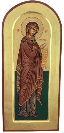 Ikona Matki Bożej - wizerunek określany greckim tytułem Mesitria - Pośredniczka dusz (w potrzebie, idących do nieba) Wykonana na płótnie lnianym wklejonym w drewno. Tło ikony jest wykonane ze sproszkowanego złota. Ikona posiada stosowny certyfikat.