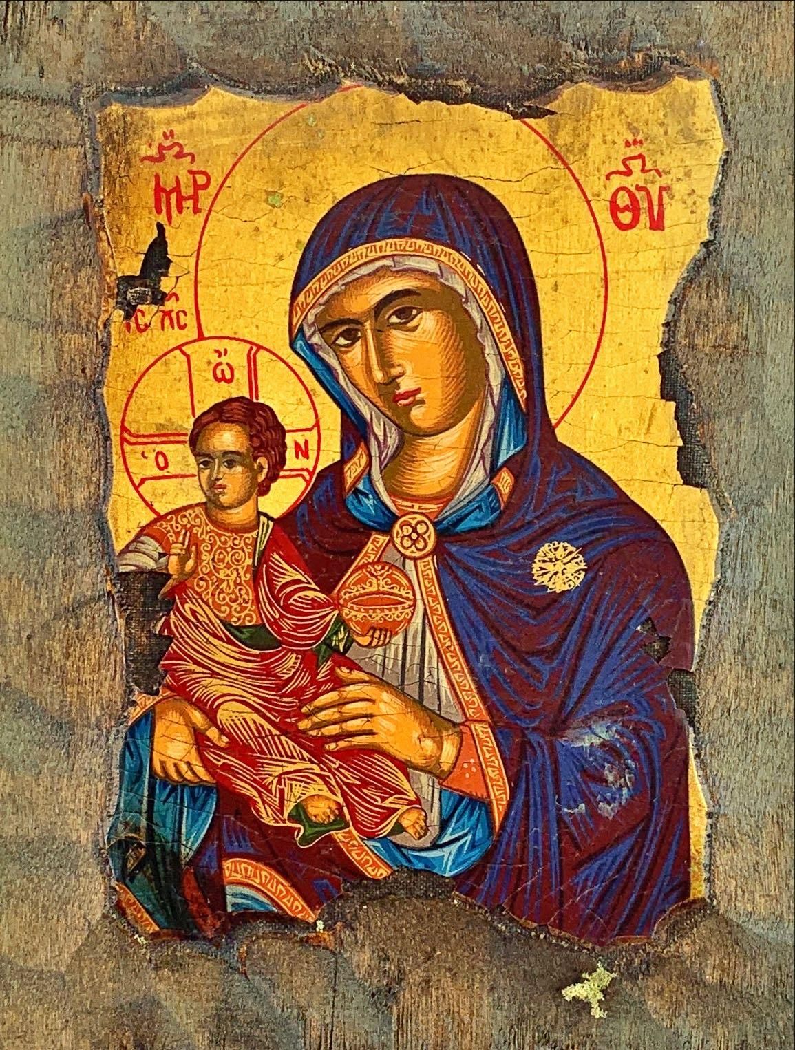 Ikona z wizerunkiem Matki Boskiej z Jezusem, wykonana na ciosanej desce, specjalnie postarzana. Do zawieszenia na ścianie. Ikona posiada stosowny certyfikat. Wysokość: 15 cm Szerokość: 11,5 cm Grubość deski: 2 cm