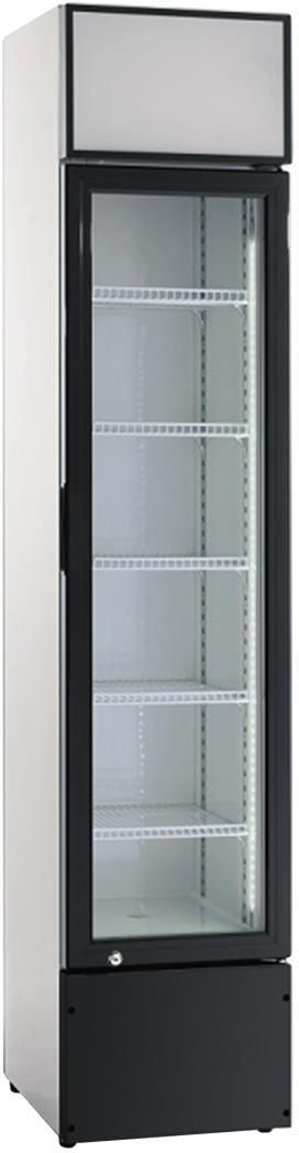 Profesjonalna Witryna Chłodnicza 160L SS-P160FA Slim - SS-P160FA SLIM OPIS Gastronomiczna witryna chłodnicza o pojemności 160 litrów. Wyposażona jest w chłodzenie nawiewowe (wymuszone wentylatorem), automatyczne rozmrażanie, oświetlenie typu LED, podświetlany panel reklamowy, 5 regulowanych półek oraz elektroniczne sterowanie Dane techniczne Wymiary zewnętrzne(szer. x głęb. x wys.): 39x47,5x188 cm Wymiary wewnętrzne(szer. x głęb. x wys.): 30x36x125 cm Pojemność: 160 l Materiał obudowy: stal lakierowana na czarno Zakres temperatur: +0... +10°C Czynnik chłodniczy: R-600a Chłodzenie dynamiczne (wymuszone wentylatorem): tak Moc: 140 W Średnie dobowe zużycie energii: 2,4kWh/24h Zasilanie: 230 V Waga: 60 kg Profesjonalna Witryna Chłodnicza 160L SS-P160FA Slim