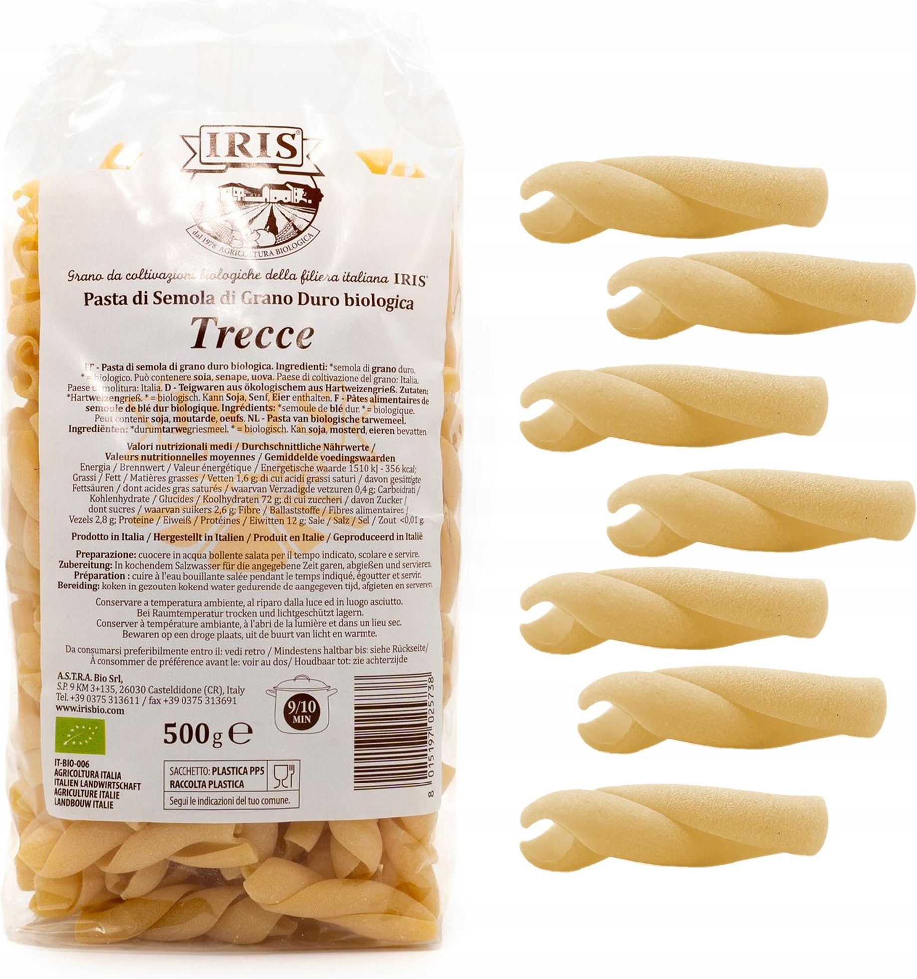 Odkryj wyjątkowy smak włoskiej kuchni z naszymi trecce! Ten pleciony makaron, wykonany z ekologicznej semoliny durum, zachwyci Cię delikatnym smakiem i oryginalnym kształtem. Dlaczego warto wybrać nasze trecce? Ekologiczne: Wyprodukowane z certyfikowanych ekologicznych składników, bez użycia sztucznych nawozów i pestycydów. Tradycyjne: Wyprodukowane we Włoszech według tradycyjnych receptur. Wszechstronne: Idealne do gęstych sosów, zapiekanek i dań mięsnych. Smakowite: Chrupiąca tekstura doskonale chłonie sosy i dodatki. Oryginalny kształt: Spleciony kształt trecce dodaje potrawom wyjątkowego charakteru. Skład: 100% mąka z durum pszenicy* (*pochodzi z upraw ekologicznych). Czas gotowania: około 12 minut. Dlaczego warto wybrać markę Iris? Iris to włoska firma, która od lat specjalizuje się w produkcji wysokiej jakości makaronów ekologicznych. Produkty Iris są wytwarzane z najlepszych składników, z zachowaniem tradycyjnych metod produkcji.