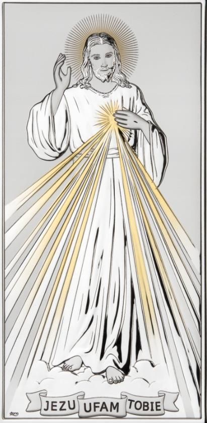 Jezu ufam Tobie DS26/2O obrazek srebrny Obrazek srebrny ze złoceniami przedstawiający wizerunek Jezusa Miłosiernego z napisem Jezu ufam Tobie Wykonany z blachy dwuwarstwowej aluminium i srebra. Zewnętrzna warstwa srebra pokryta jest zabezpieczającym lakierem, dzięki któremu produkt zachowuje blask. Prezentowany produkt jest odporniejszy na odkształcenia mechaniczne i śniedzenie, doskonale odbija światło, co podkreśla szlachetność srebra. Do czyszczenia wystarczy miękka ściereczka lub ciepła woda; nie zaleca się stosowania środków chemicznych, również tych przeznaczonych do czyszczenia srebra, które mogą zniszczyć wierzchnią warstwę ochronną. Obrazek zapakowany jest w eleganckie pudełko z załączonym certyfikatem. Osadzony jest na lakierowanym drewnie; można go zawiesić lub postawić dzięki dołączonej do zestawu nóżce. Produkt został całkowicie wyprodukowany we Włoszech. Idealnie nadaje się na prezent z okazji ślubu, rocznicy, urodzin i wielu innych. Wymiary: 75x150 mm Producent: Ver Vitas EAN: 5000000064120