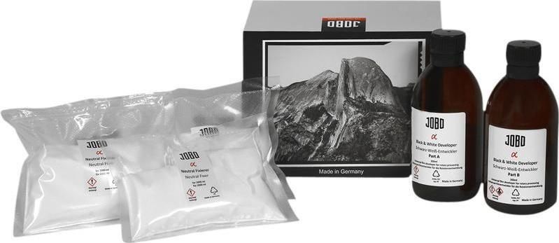 alpha B&W kit 6L Wywoływacz negatywów JOBO alpha B&W z neutralnym utrwalaczem JOBO zaprojektowało wywoływacz do filmów, który pozwala w pełni wykorzystać czułość filmu, a jednocześnie charakteryzuje się bardzo drobnym ziarnem i dużą ostrością. W połączeniu z utrwalaczem JOBO alfa neutral, cały proces filmowy odbywa się w środowisku od zasadowego do neutralnego. W zestawie 300 ml butelka części A i 300 ml części B do sporządzenia 6L roztworu roboczego JOBO alpha Developer. Zawiera 3 opakowania Neutral Fixer, aby stworzyć 3x 2L roztworu roboczego. (Pojemność: 50 filmów).