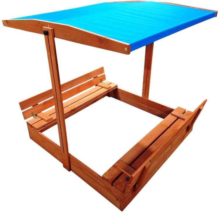 Drewniana piaskownica z daszkiem chroniącym dziecko przed słońcem, który można po zakończonej zabawie można opuścić, aby chronił piasek przed zwierzętami, liśćmi itp. Piaskownica wykonana jest z drewna świerkowego, impregnowana ekologicznym impregnatem wodnym. Po otwarciu piaskownicy powstają dwie wygodne ławeczki, dzięki czemu maluch będzie mógł wygodnie usiąść podczas zabawy lub odłożyć na bok butelkę z napojem. Daszek pokryty jest wytrzymałą tkaniną poliestrową. Daszek jest regulowany- zarówno jego wysokość jak i pochylenie. Dno z agrowłókniny zapobiega wymieszaniu piasku z podłożem oraz wyrastaniu trawy jednocześnie w naturalny sposób przepuszczając wodę i powietrze. Piaskownica wysyłana jest w zestawie do samodzielnego montażu. W zestawie znajdują się wszystkie śruby, wkręty i zawiasy oraz instrukcja składania. Wymiar piaskownicy - ok. 120 cm x 120 cm - wysokość ok. 20 cm - grubość desek ok. 2 cm Piaskownica jest doskonałym miejscem zabaw dla dzieci, oraz stanowi wspaniałą ozdobę ogrodu.