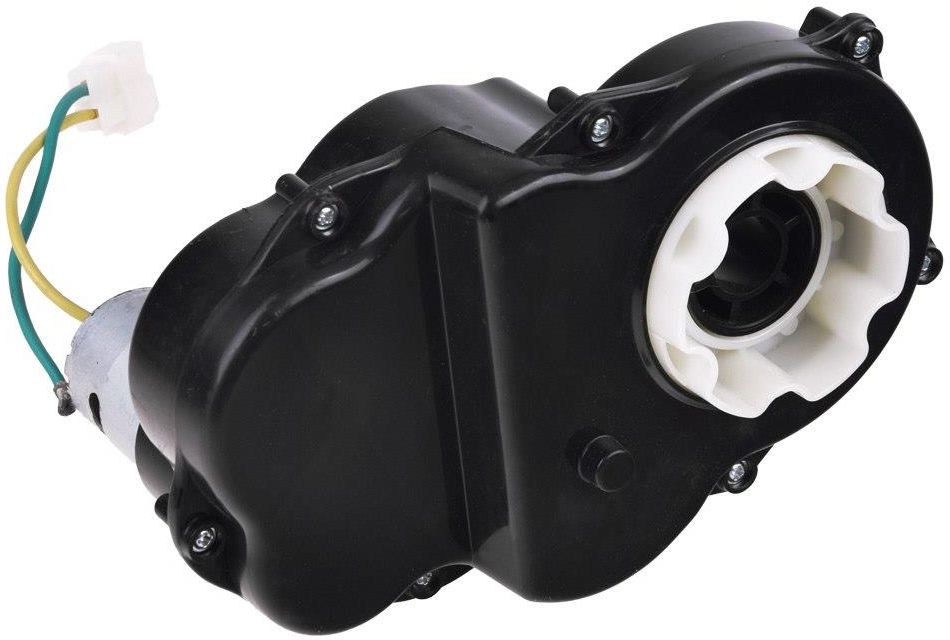 Przekładnia pasuje do autek napędzanych na akumulator o napięciu 24V. Przekładnia składa się z wielotrybów, silniczka elektrycznego oraz plastikowej obudowy. Parametry przekładni: długość całkowita: 18,5 cm szerokość: 12cm max. wysokość 13 cm średnica zębatki zewnętrznej: 6,5cm promień pół otworów na zębatce zewnętrznej: 6 x 0,6cm waga całkowita: 0,75 kg Parametry silniczka w przekładni: DC 12V RPM: 13500 obr/min średnica silniczka: 3,5 cm