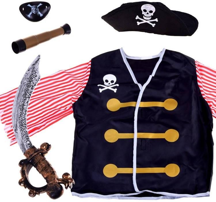 Świetny strój pirata w sam raz na bal lub inną okazję. Efektowny zestaw sprawdzi się podczas domowych zabaw, balu karnawałowego lub Halloween. Strój został ładnie wykonany z dbałością o detale. Zachwyci każdego małego pirata. W zestawie znajduje się Luneta, którą można złożyć. Strój wiekowo odpowiedni jest dla dzieci od 3 roku życia. Zestaw zawiera - piracki kapelusz - miecz - luneta - przepaskę na oko - bluzę Wymiary (mierzone na płasko): bluza długość ok. 44,5 cm szerokość 42,5 cm rękaw mierzony od ramienia długość ok. 36 cm kapelusz z rondem średnica zewnętrzna 28,5 cm wewnątrz ok,14 cm długość miecza 47,5 cm długość lunety po rozłożeniu 18 cm opaska na oko 8 cm x 5,5 cm Kapelusz został wykonany z filcu, bluza wykonana z lekkiego materiału zapinana na rzepy, zaś miecz, luneta i przepaska na oko z plastiku. Piracki strój pozwoli przeżyć twojemu dziecku wspaniałe chwile radości podczas zabawy. AHOJ PRZYGODO!