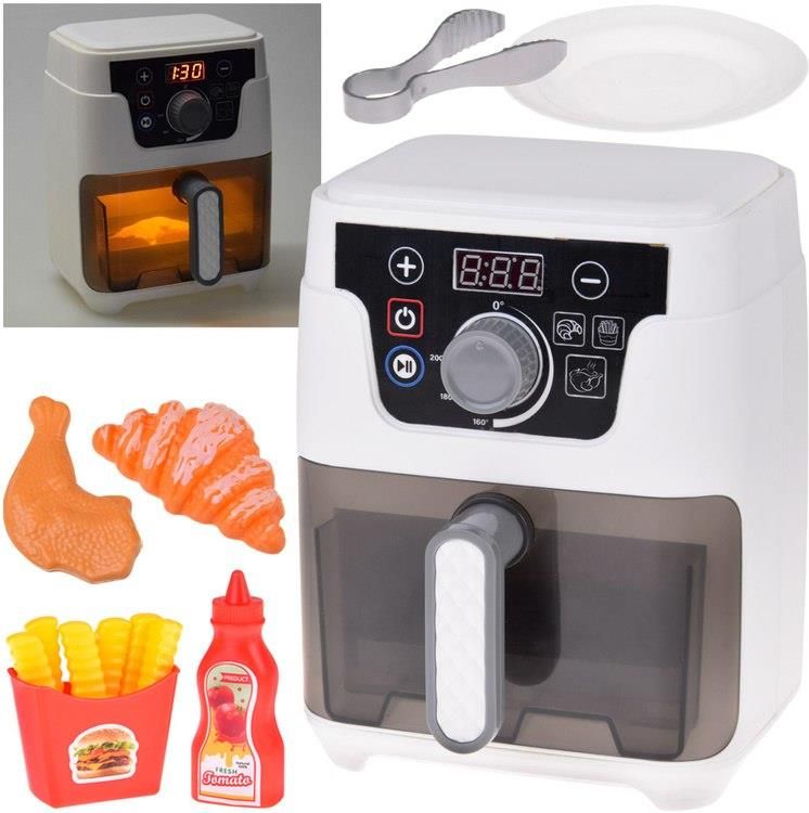 Frytkownica beztłuszczowa AIR FRYER zabawka dla dzieci małe AGD ZA5686 Świat oszalał na punkcie beztłuszczowych frytkownic. Przyrządzone w nich dania są zdrowsze i smakują równie wspaniale, co przygotowane w tradycyjny sposób. Więc oczywiste jest, że takie urządzenie przyda się w każdej zabawkowej kuchni! Krótka instrukcja, jak obsługiwać urządzenie zabawka uruchamiana jest przyciskiem ON/OFF. Uruchomieniu towarzyszy krótki sygnał a na wyświetlaczu pojawi się 0:00 pokrętłem ustawiamy pożądaną temperaturę- zakres 0°- 200° C, podczas przekręcania usłyszymy charakterystyczny dźwięk + i - ustawiamy czas pracy- każde naciśnięcie to zmiana o 10 sekund do wyboru mamy także programy automatyczne: do pieczywa (ikonka z rogalikiem), frytek i mięs (ikonka z kurczakiem) aby włączyć air fryer'a należy nacisnąć okrągły guzik z niebieską obwódką Jakie atrakcje czekają na użytkownika? podczas naciskania guzików na panelu usłyszymy krótkie sygnału kolorowy wyświetlacz odliczający czas gdy air fryer działa usłyszmy charakterystyczny dźwięk smażenia kosz do pieczenia jest podświetlany na chwilę przed zakończeniem cyklu usłyszymy dźwiękowe odliczania a następnie dzwonek informujący nas, że potrawa jest gotowa po wyjęciu i włożeniu koszyka usłyszymy dźwięk otwierania/zamykania jeśli zabawka przez chwilę nie jest używana automatycznie się wyłącza Co zawiera zestaw? air fryer'a z funkcjami dźwiękowymi i świetlnymi i wyciąganym koszem ruszt do kosza talerz croissanta nóżkę z kurczaka 6 karbowanych frytek pojemnik na frytki butelką ketchupu szczypce Uwaga! produkty nie nadają się do spożycia! Wymiary air fryer'a: ok. 20,5 cm x 15 cm x 12 cm Zabawkowy sprzęt agd dla dzieci to nie tylko świetna rozrywka ale również forma nauki i rozwoju dziecka. Podczas zabawy dziecko: naśladuje dorosłych, co rozwija zrozumienie świata i zasad funkcjonowania domu uczy się do czego służy pralka, zmywarka, piekarnik itd. – poznaje związek między działaniem a efektem odtwarza role społeczne- zabawa w dom, gotowanie czy sprzątanie pomaga dziecku lepiej rozumieć role mamy, taty i innych dorosłych uczy się dzielenia obowiązkami, ustalania ról i komunikowania się czuje się „duże” i potrzebne, bo może wykonywać „prawdziwe” zadania domowe, co wzmacnia samoocenę rozwija kreatywność i wyobraźnię w bezpieczny sposób przygotowuje się do życia codziennego i uczy się, że obowiązki domowe są elementem codzienności i mogą być przyjemne Zestaw zapakowany w kolorowe, estetyczne pudełko, idealne na prezent. Sklep Jokomisiada oferuje szeroki wybór kuchni, garnków, zabawkowego sprzętu małego AGD... z nami w łatwy sposób stworzysz miniaturowe ale świetnie wyposażone gospodarstwo domowe! Sprawdź koniecznie. certyfikat: CE wiek: 3 + wymiar opakowania: ok. 25 cm x 18,5 cm x 17 cm waga: ok. 0,7kg płeć: dziewczynka, chłopiec baterie: 3 x AA (brak w zestawie) Długość towaru w centymetrach: 19 Wysokość towaru w centymetrach: 25 Szerokość towaru w centymetrach: 17 Waga gabarytowa w gramach: 1345.83
