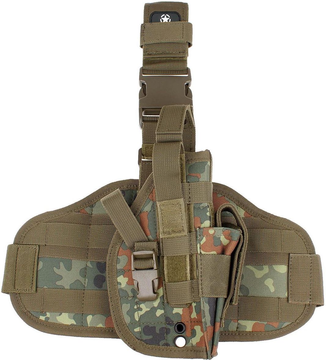 Kabura na pistolet z mocowaniem na udo "Molle" flectarn prawa Odpowiednia dla praworęcznych Wzmocniona płyta nośna z pętlami mocującymi Regulowany pasek na nogę zapinany na karabińczyk Regulowany uchwyt na pasek zapinany na karabińczyk Szlufka z rzepem ok. 6 cm Kieszeń zapinana na rzep i zatrzask …