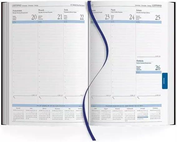 Kalendarz 2023 B5 Tygodniowy SK0-5B Prezentujemy Państwu atrakcyjny kalendarz na rok 2023 w formacie B5, o wymiarach 16,5 x 23,5 cm i liczący aż 144 strony. Kalendarz ten cechuje się wygodnym układem tygodniowym, rozłożonym na dwie strony po otwarciu, z nadrukowanymi rejestrami na każdej stronie. Wyróżnia się zastosowaniem papieru o gramaturze 80 g/m2 w jasnym, białym odcieniu oraz tłoczeniem dwukolorowym, co dodaje produktowi jej elegancji. Kalendarium zostało opracowane w czterech językach: polskim, angielskim, niemieckim i rosyjskim, a także zawiera numerację dni i tygodni, informacje o wschodach i zachodach słońca, a także potrójne imieniny. Wygoda używania kalendarza zostaje zwiększona dzięki zastosowaniu perforacji narożników stron. W kalendarzu nie zabrakło również praktycznych informacji, takich jak plan roczny, miesięczny, telefony kierunkowe oraz skorowidz alfabetyczny. Co więcej, produkt wyposażono także w drogową mapę Polski, administracyjną mapę Europy, a także mapki z odległościami drogowymi zarówno w Polsce, jak i Europie. Dodatkowym atutem jest zestawienie kalendarza stuletniego, informacje o strefach czasowych oraz daty imienin i inne ciekawostki. Wybierając kalendarz 2023 B5 Tygodniowy SK0-5B, otrzymujecie Państwo praktyczne i eleganckie narzędzie do zarządzania czasem, które z powodzeniem posłuży przez cały nadchodzący rok. Idealne do domowego czy biurowego użytku dla każdego, kto ceni sobie dobrą organizację i styl. EAN: 5906408000633